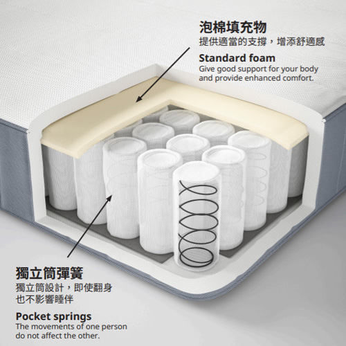 IKEA strictly controls the formaldehyde content, and insists that we don’t use chemical substances that are harmful to people and environment. We used a sleeping robot to imitate the human body and roll 50,000 times to test for durability. We provide 10-years guarantee for the quality of many mattresses.