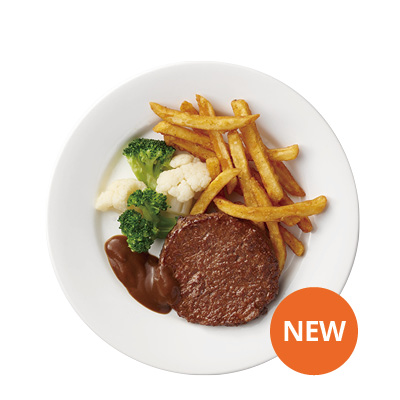 Plant-based hamburger steak, Fries, Mixed vegetables, Demi-glace sauce.