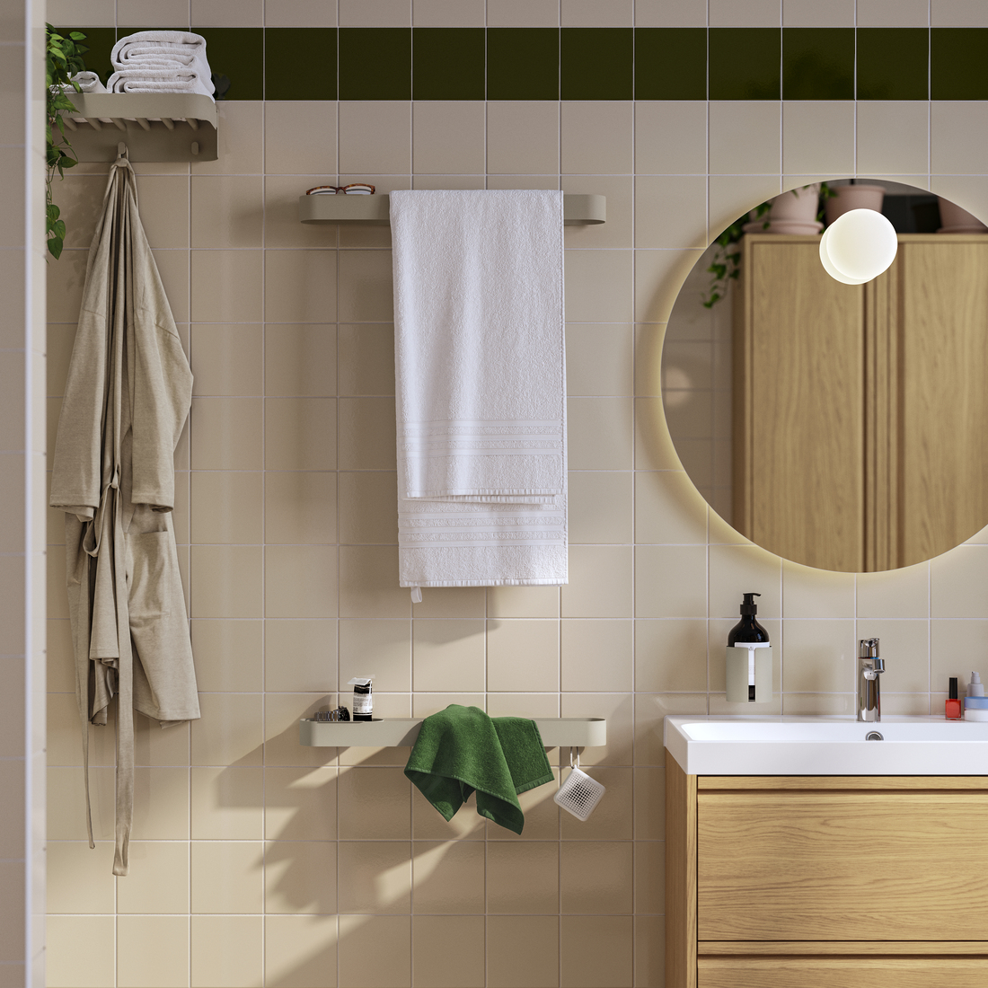 Clay, oat, grey-beige? This versatile colour lifts our minimalistic, new FLORSJÖN series of practical, sleek storage that you can add almost anywhere. Its fixtures like hooks, towel rails and shelves have drainage holes, handy trays and tumble-reducing edges - details that may go unnoticed but are included anyway for a better every day."