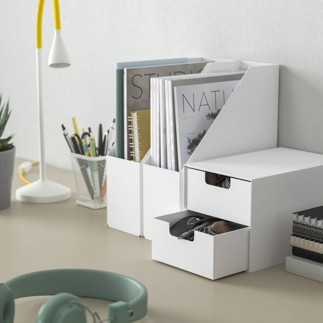 The FJÄDERHARV series gives you clutter-busting homes for stuff like pens, USB sticks, magazines, headphones or board games. The shared look and compatible sizes of the boxes and organisers make using them together very easy. And they fit and coordinate with many of our bookcases and other storage furniture.