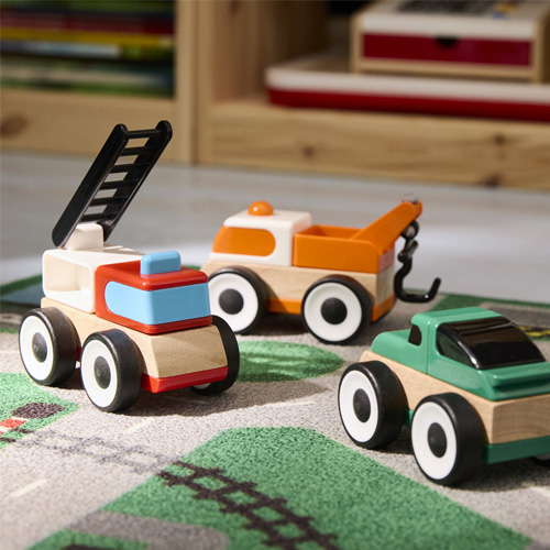 Yay! That's probably the word that best summarizes the new LILLABO series. The wooden cars come in different models, shapes and colours, ready to roll around on the streets of town. That town on the rug can grow from small to big, since the roads connect if two or more rugs are combined. In the middle there's a perfect spot for the garage, complete with a car wash and helipad. The wooden quality is a guarantee for longevity, which is extra important for toys classic enough to keep their popularity for generations.