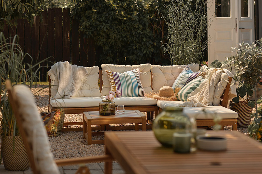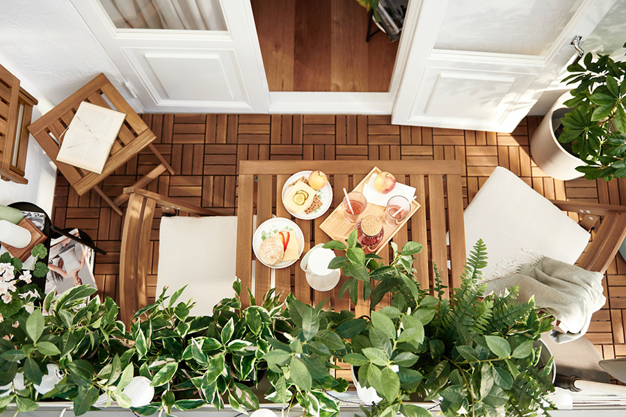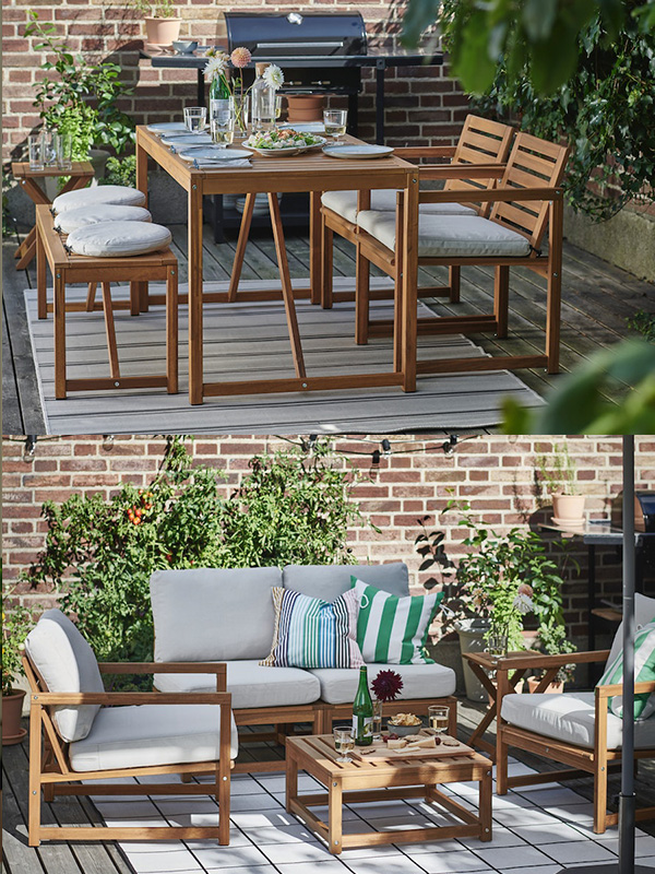 All products in the NÄMMARÖ series are made of solid, sustainably sourced, hardwood acacia, commonly used in outdoor furniture because of its durability. All pieces come pre-treated with several layers of wood stain so they will stay fresh and new looking longer before any maintenance is needed.
