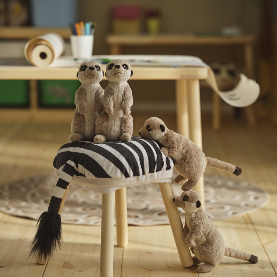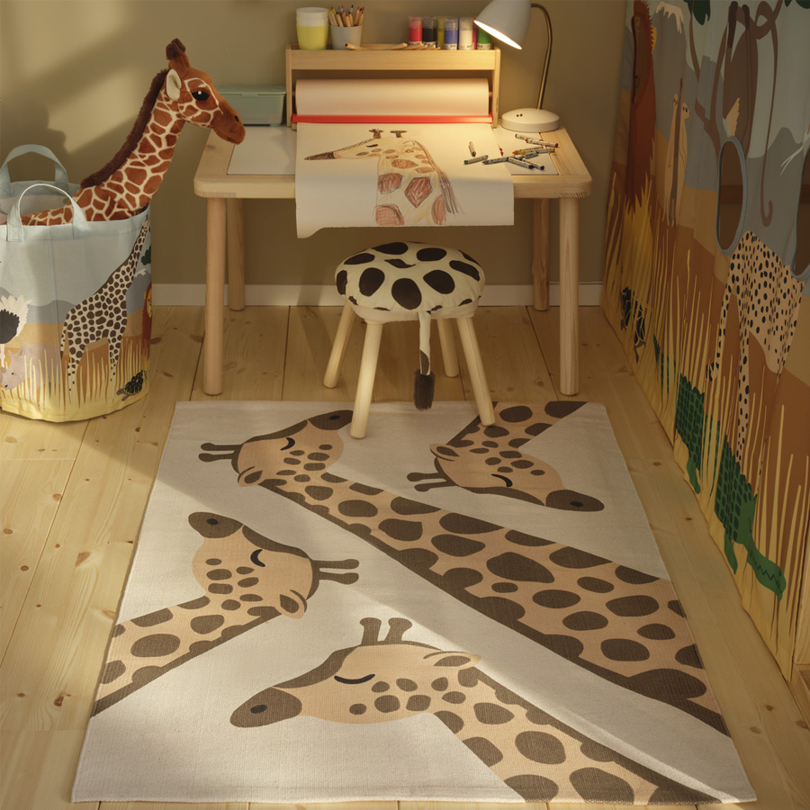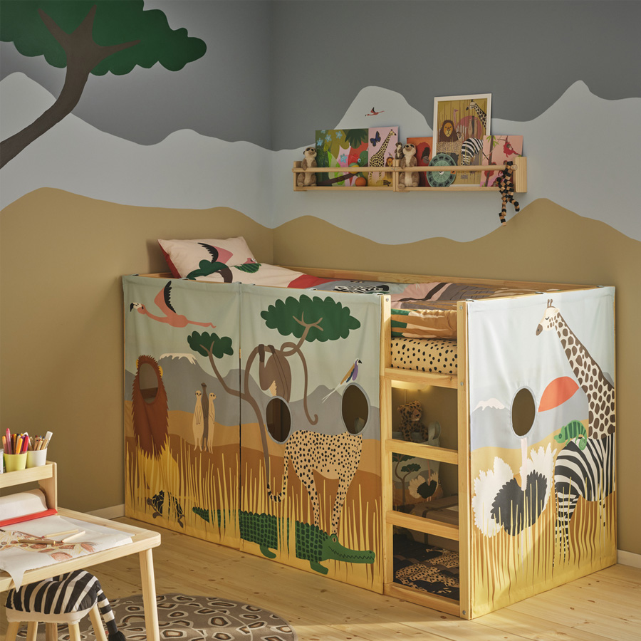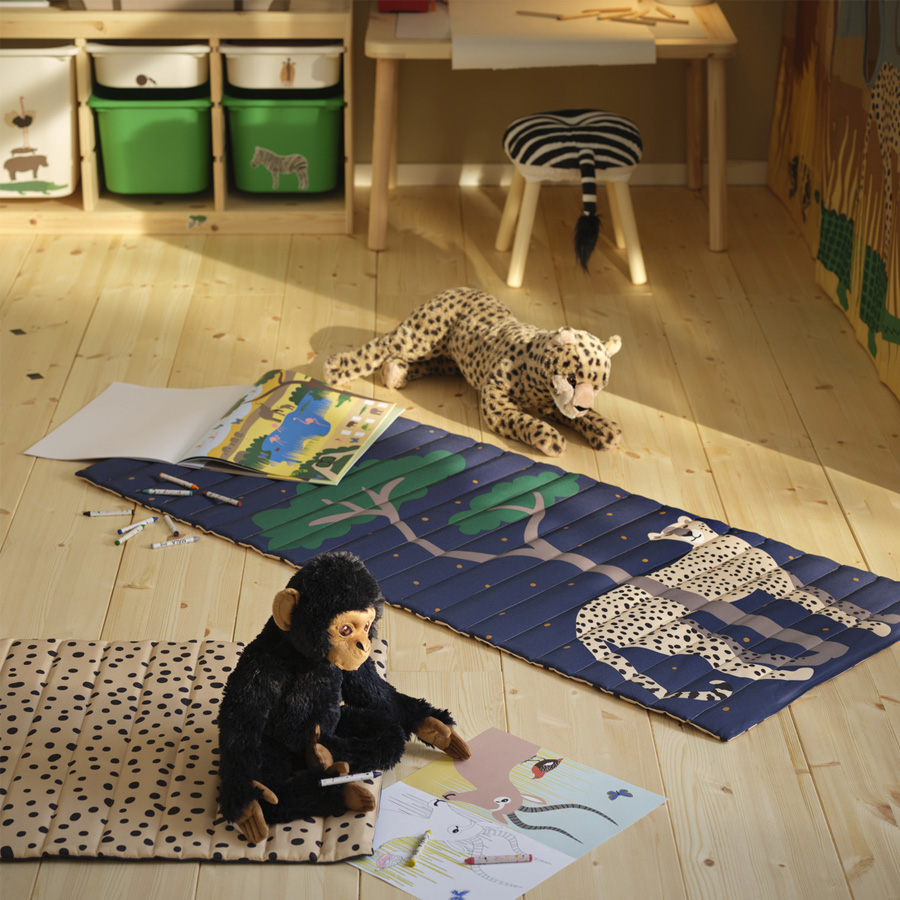 As the days grow darker and colder outside your window, why not transform your children's room into a warm and sunny savannah? With colourful textiles, cuddly soft toys and detailed illustrations by Anna Lagerström, the SANDLÖPARE collection brings you brown spots, black stripes and red suns. If you want to enhance the room even further, you can also bring the colours and shapes of the savannah onto your walls. Simply take a photo of one of the illustrations, project it on the wall, scale according to your liking and paint away.
