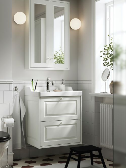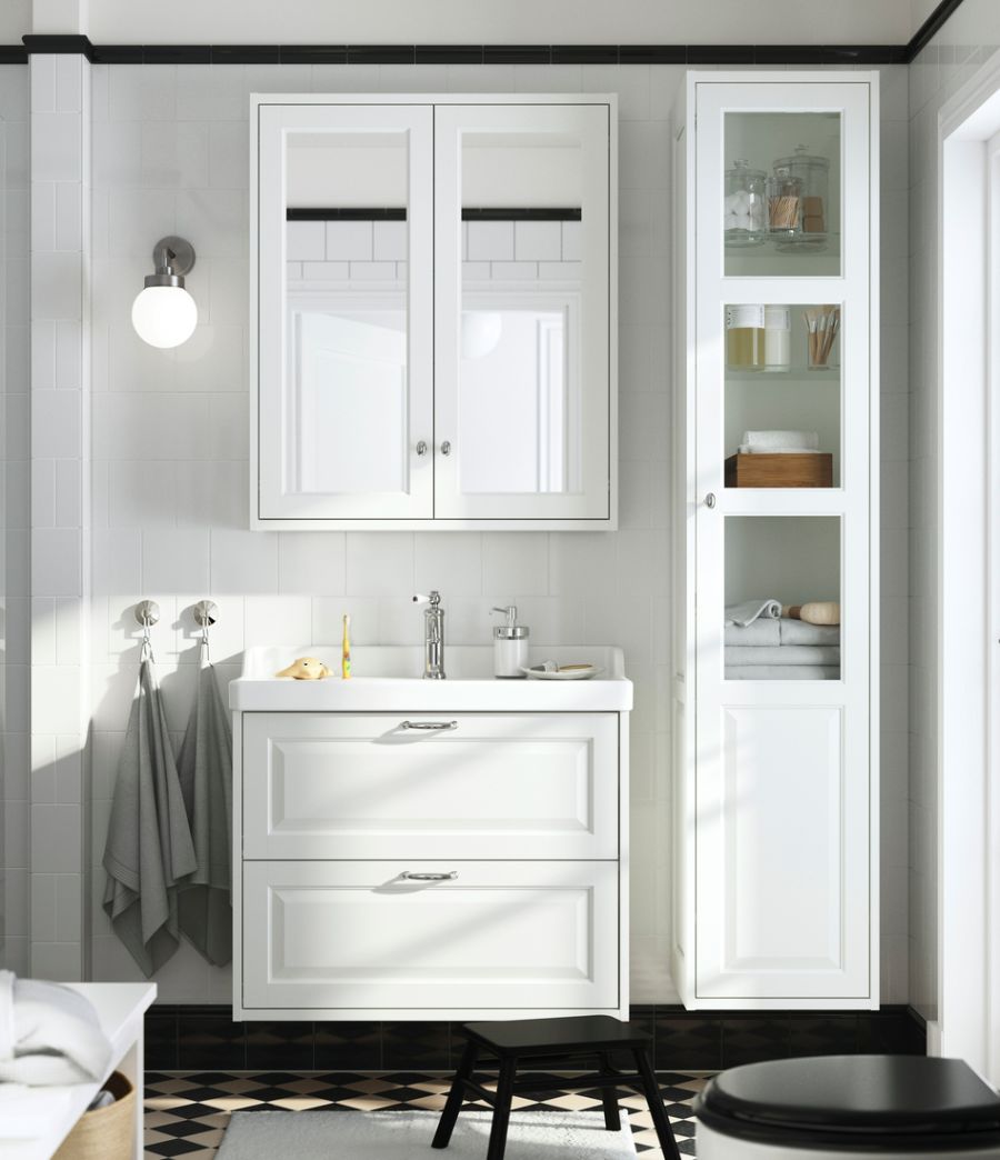 The TÄNNFORSEN system includes bathroom cabinets with soft-close doors, wash-stands with drawers and more. The timeless design comes in a range of light classic finishes and combines elegant, crafted details with generous storage solutions for modern comfort and clutter-free calm.