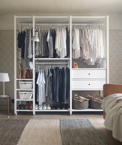 ELVARLI is so adaptable you can organise a reach-in closet, walk-in wardrobe, corner turned clothing nook, and even a room divider if you fasten it to the floor and the ceiling – pretty much any open space. Try our ELVARLI planner now!