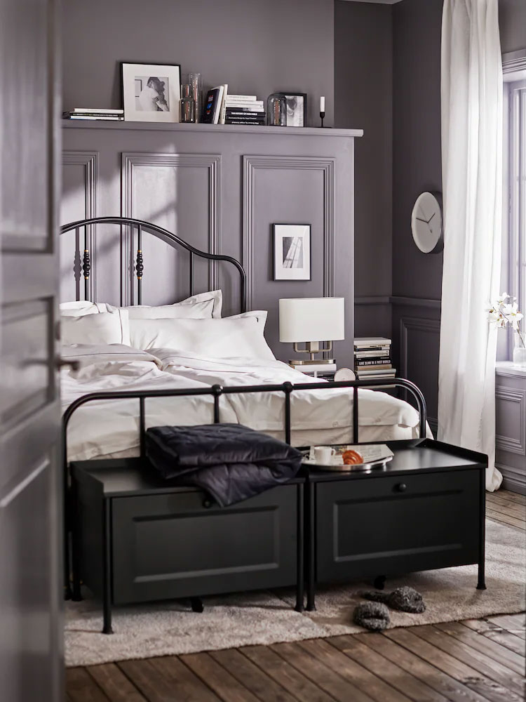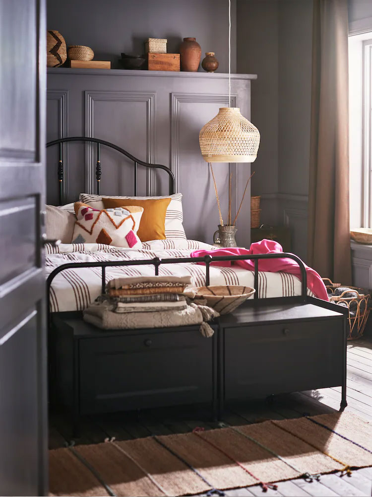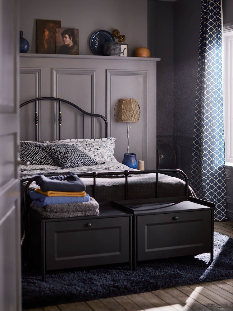 A well-coordinated palette of blue nuances sets a calm and relaxing atmosphere in your bedroom. Adding geometric and floral patterns brings it together to a rich, classic look.