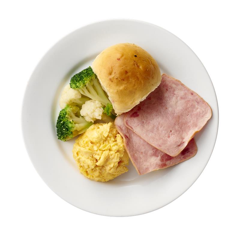 Multigrain bread, ham, scrambled egg and mixed vegetables.