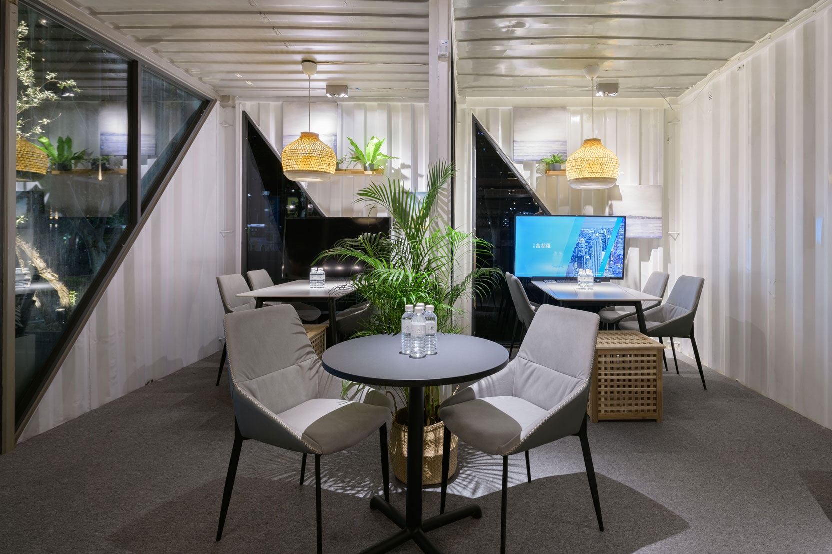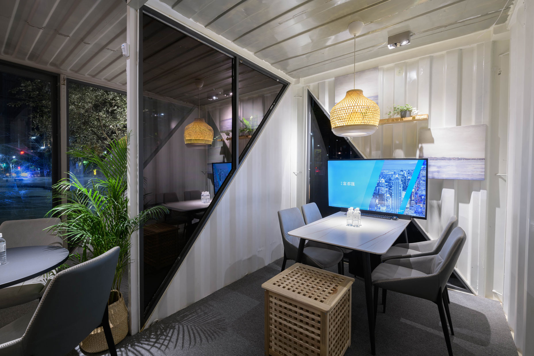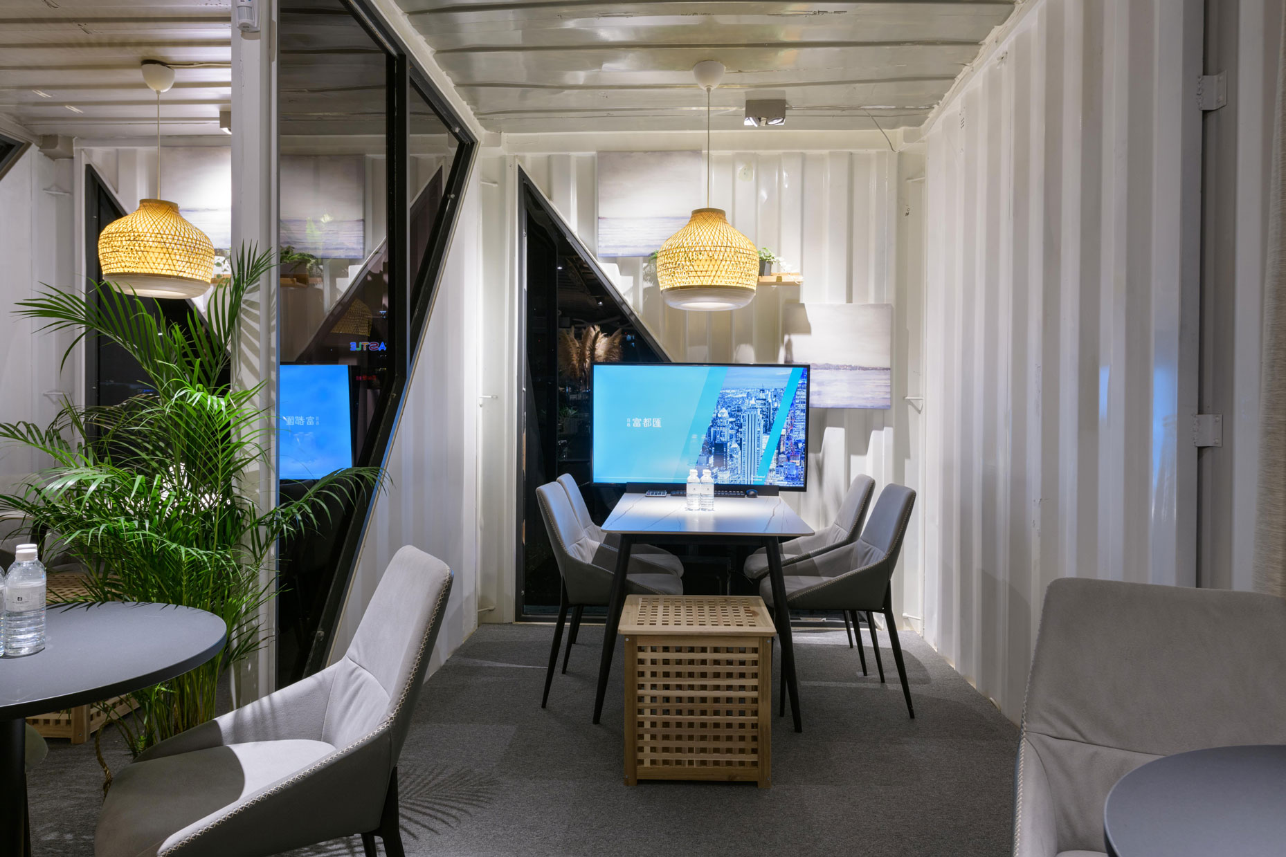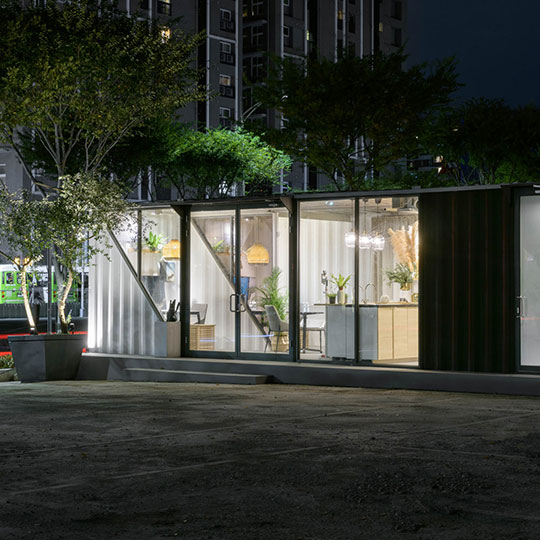 Xinzhuang Fuduxin Container House Reception Center is a warm spot in the urban jungle. The gentle tones of bamboo materials are matched with warm and bright lighting to create a soft and comfortable atmosphere. Spacious countertops are matched with black marble and wood, besides distinguishing the seating area, it makes the space more layered. In addition, container house can be recycled and reused to help reduce environmental burdens and realize the vision of a circular economy.