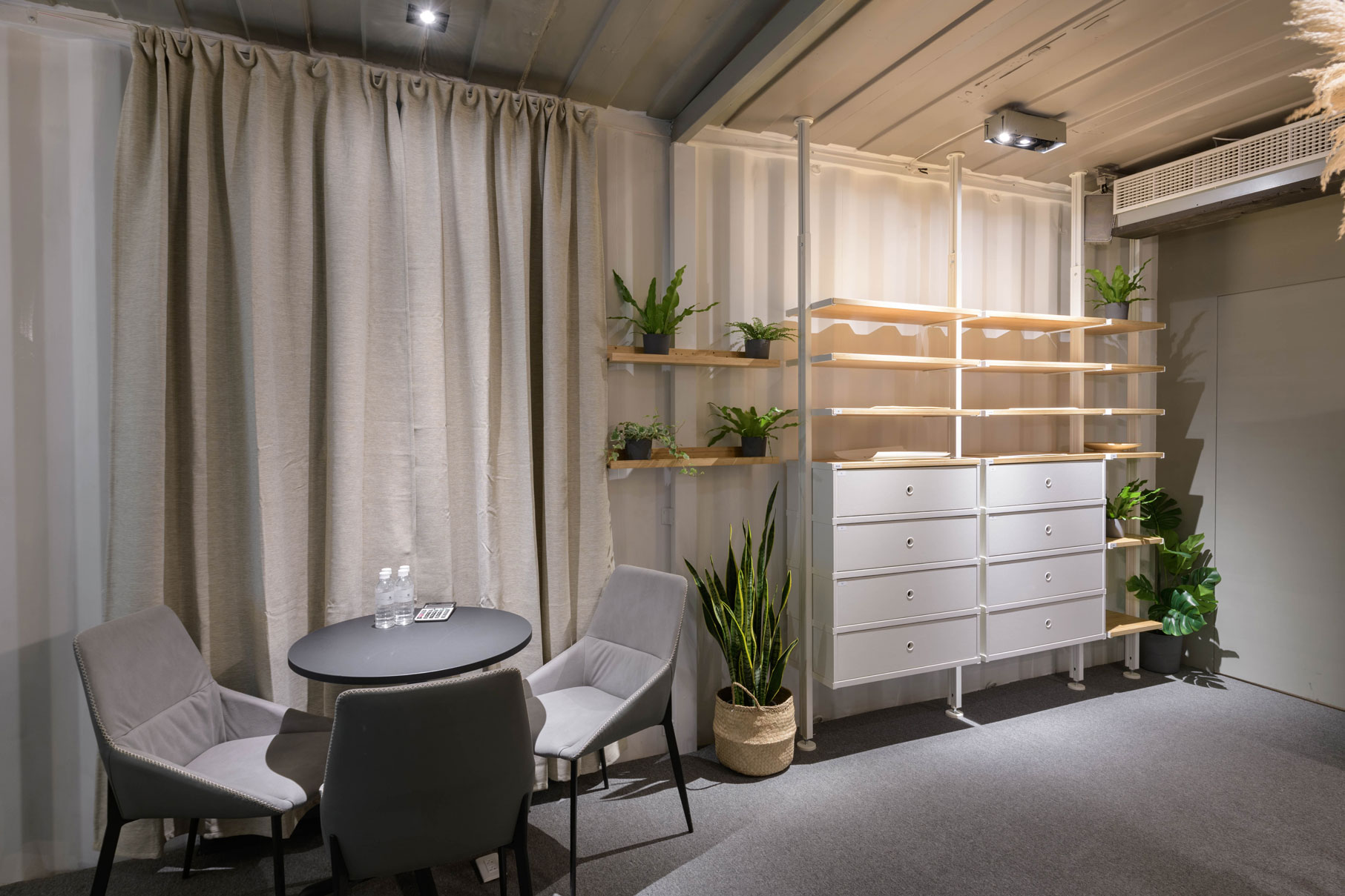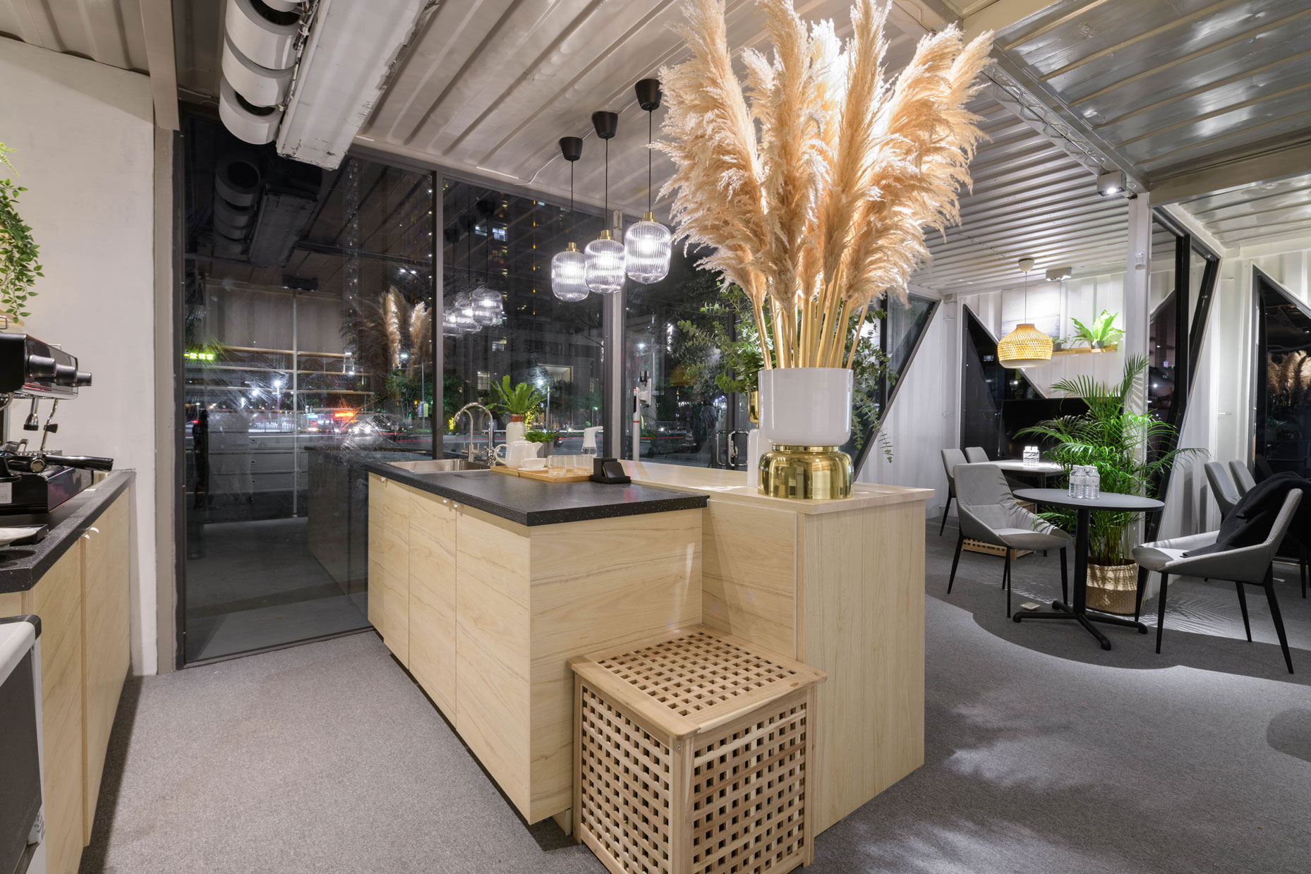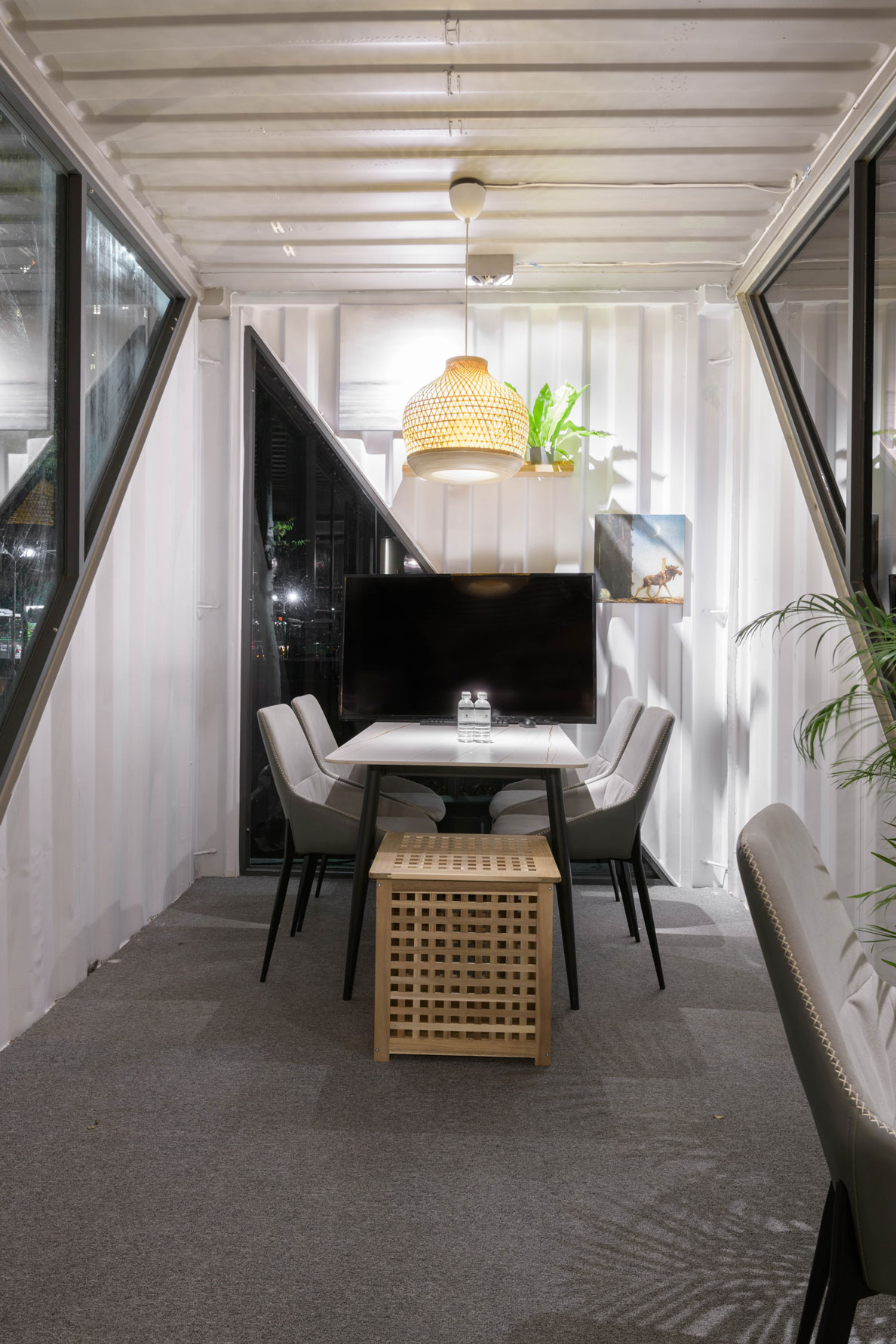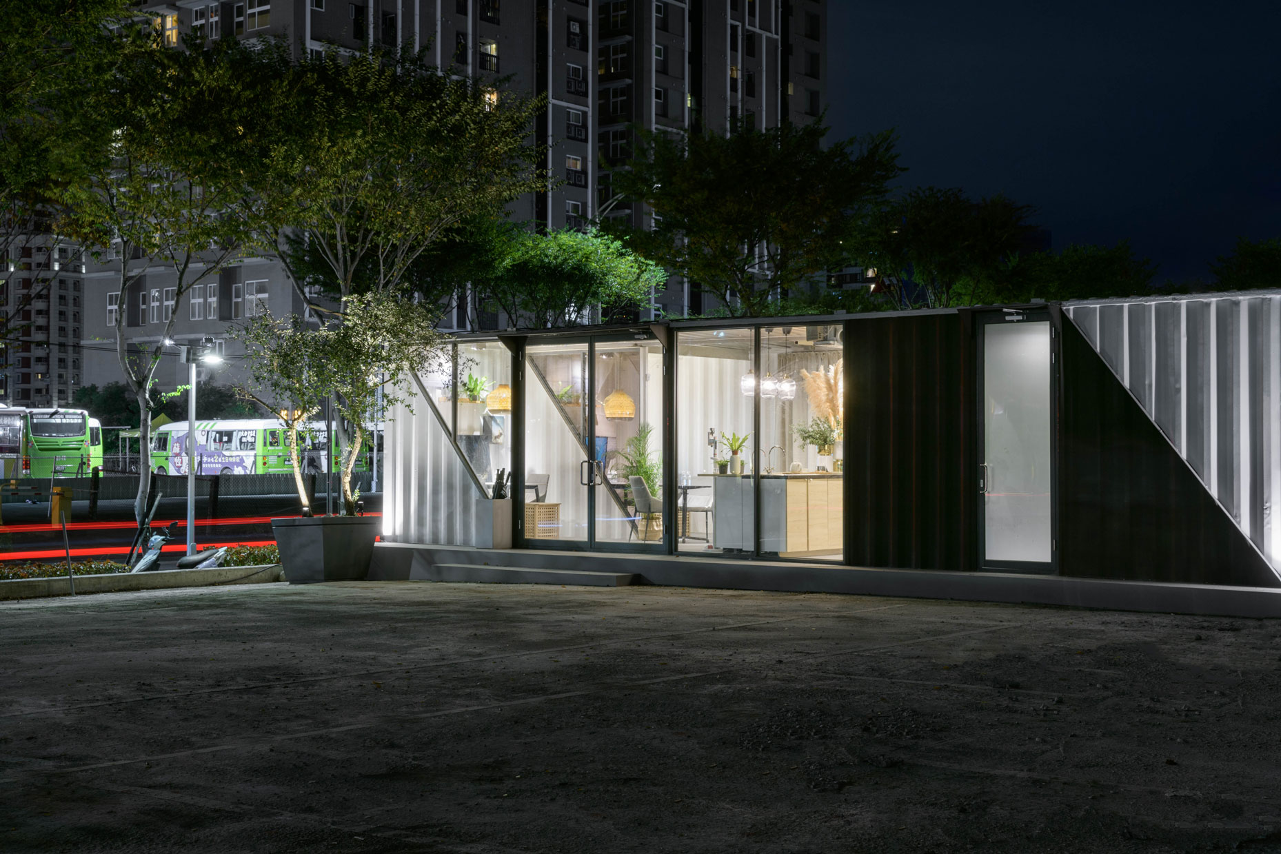 Xinzhuang Fuduxin Container House Reception Center is a warm spot in the urban jungle. The gentle tones of bamboo materials are matched with warm and bright lighting to create a soft and comfortable atmosphere. Spacious countertops are matched with black marble and wood, besides distinguishing the seating area, it makes the space more layered. In addition, container house can be recycled and reused to help reduce environmental burdens and realize the vision of a circular economy.