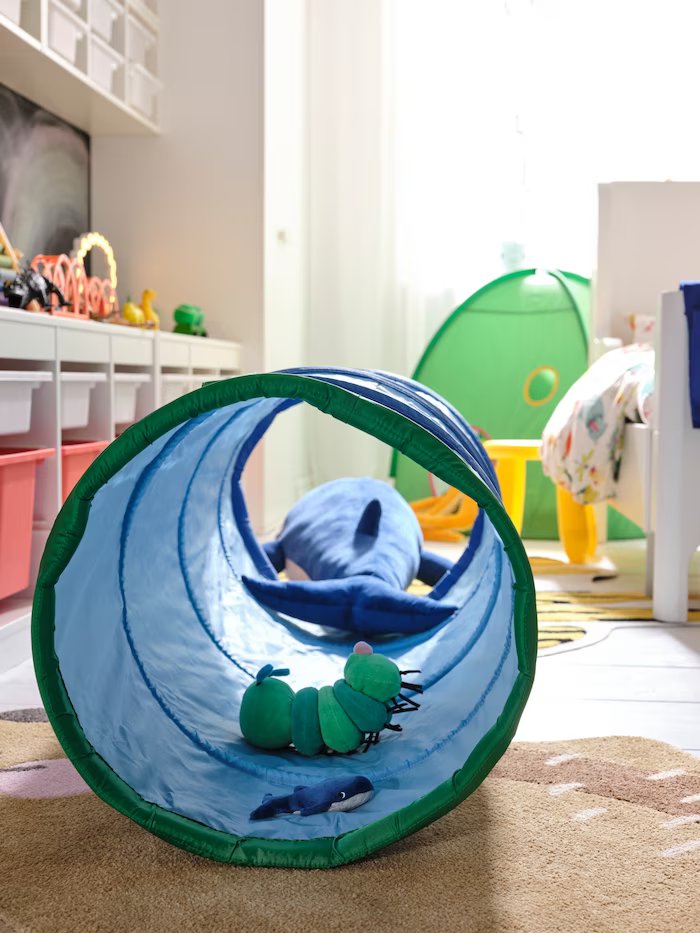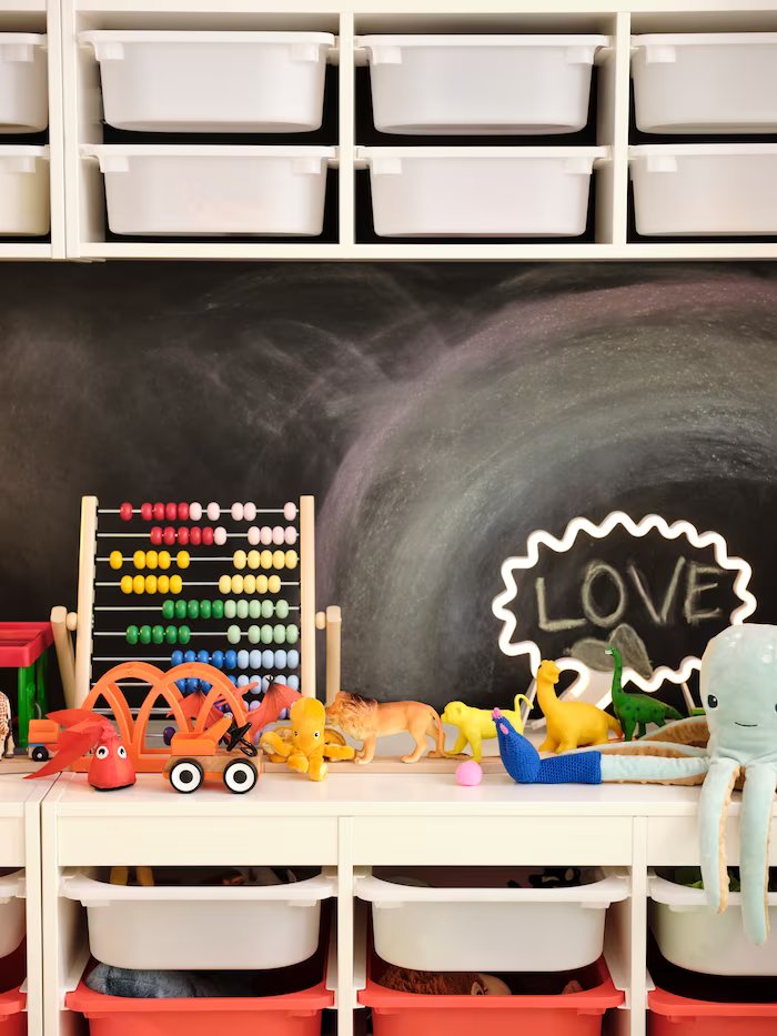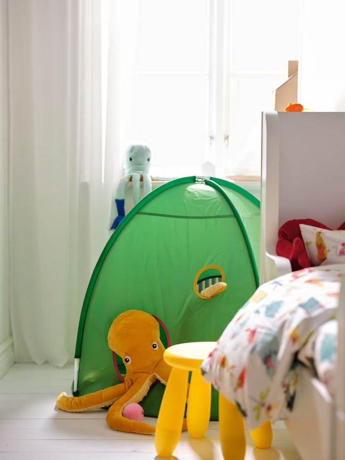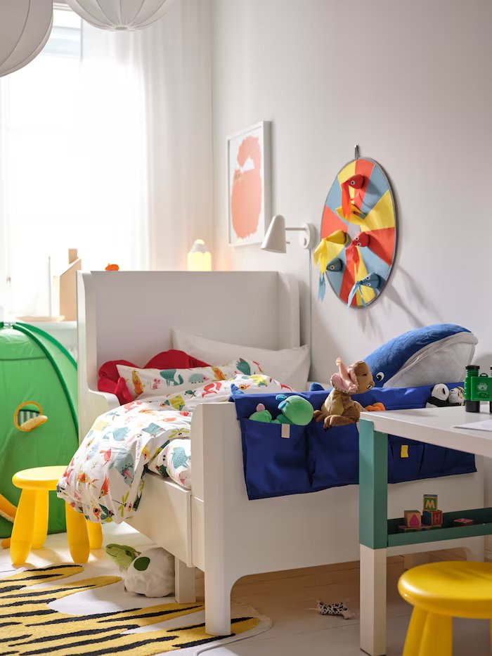 Loaded with colour, the white extendable bed is a great base to set the playful feel. Fun animals on the bed linen make friends with the cute soft toys who love to hang out there. More toys, cartoon-style furniture, pictures and a lamp nestle around the bed and on the wall, keeping the joyful energy alive.