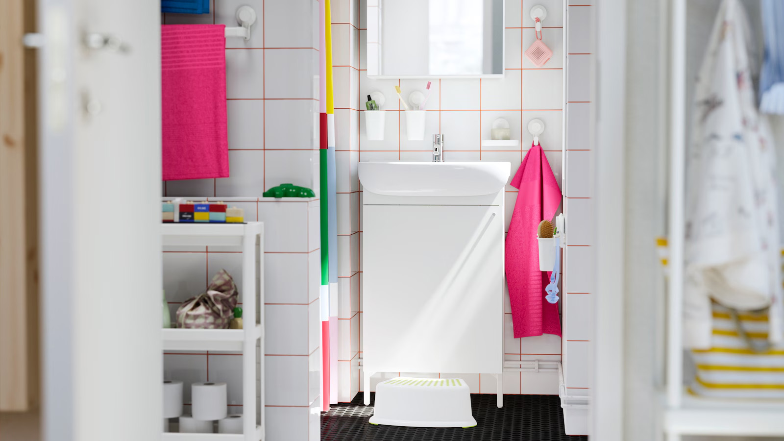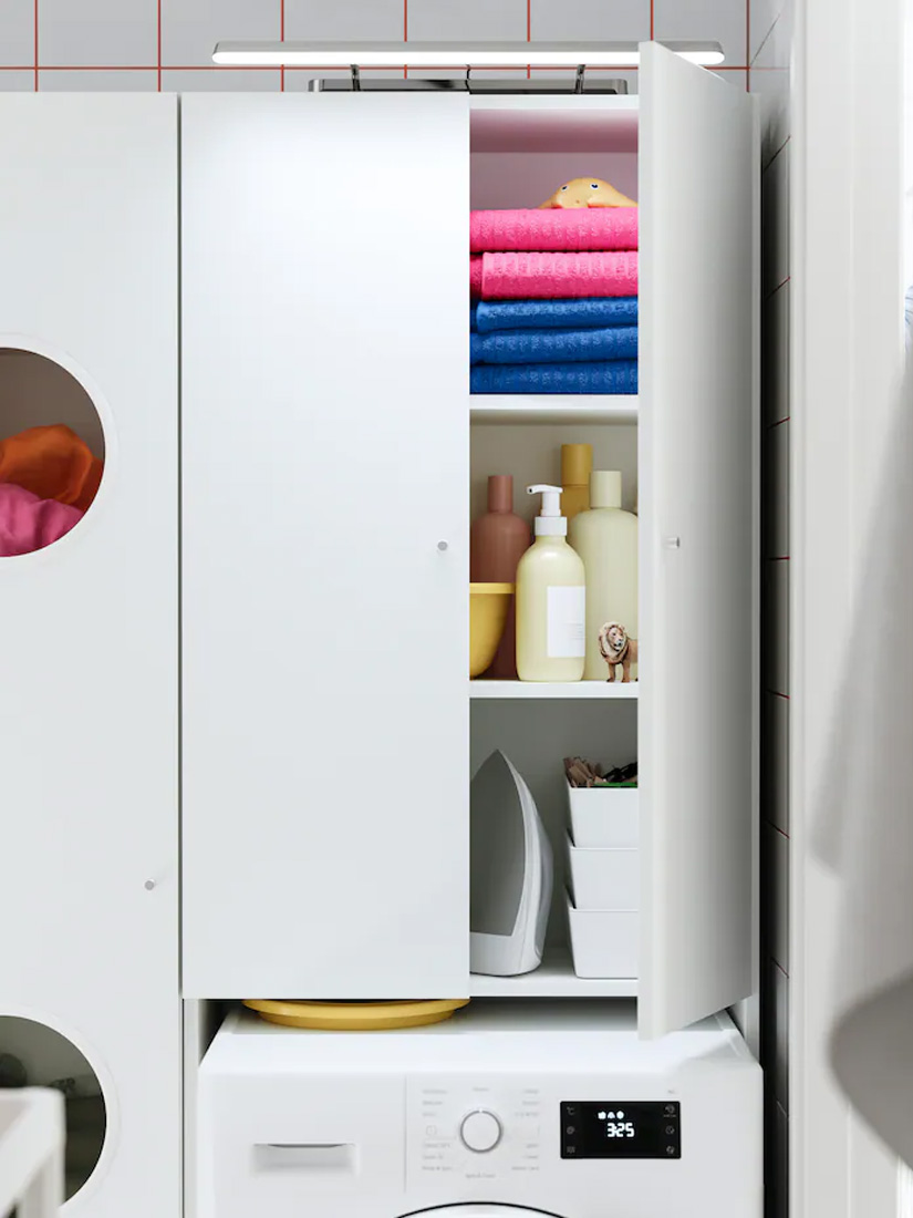 Here, a combination of closed storage and the NYSJÖN laundry cabinet creates both calm and functionality. The FLASKPOST LED cabinet light provides even, glare-free illumination, enhancing visibility and ease, while the accessible laundry compartments make it easy and fun for kids to get involved in the laundry sorting.