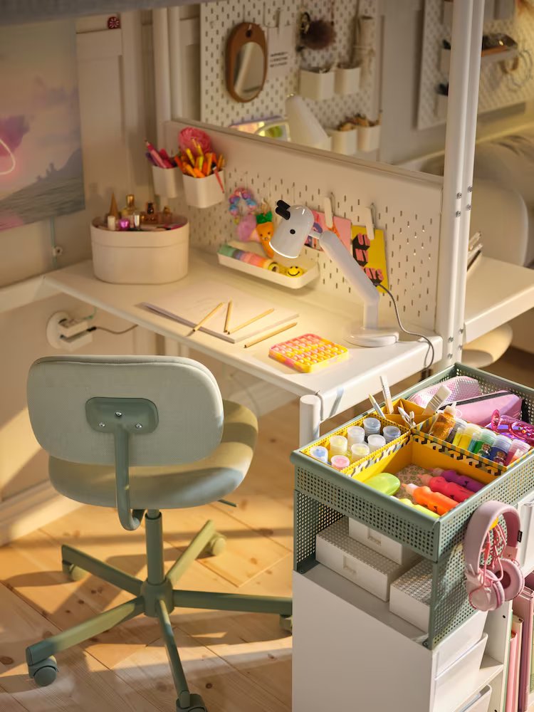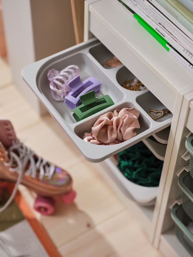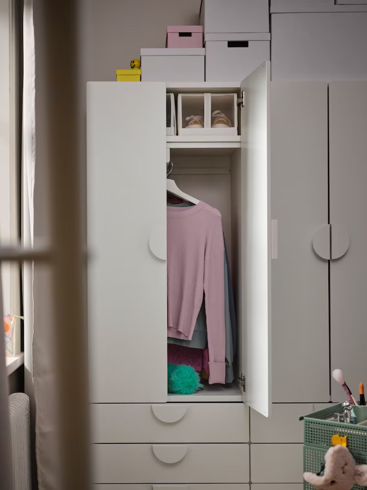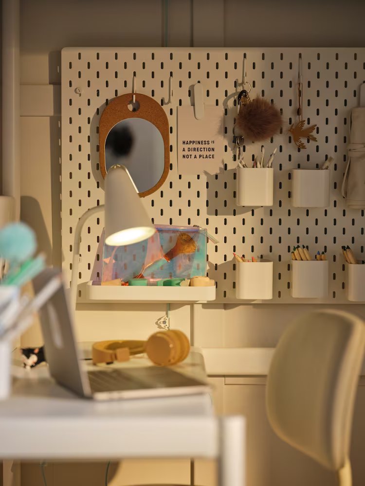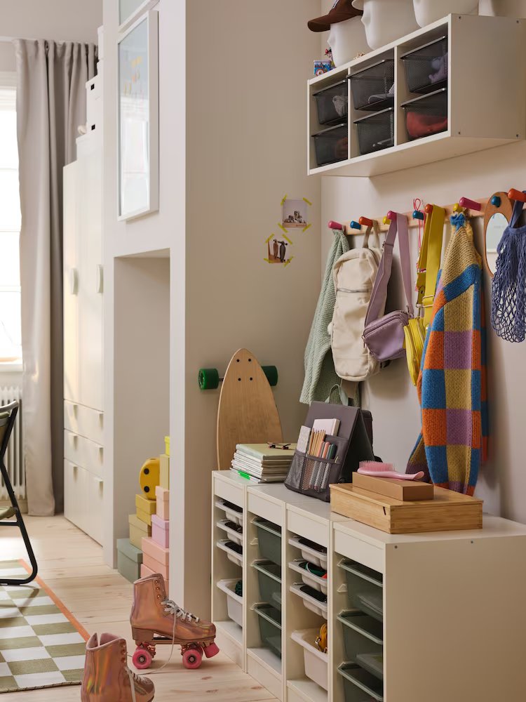 With calming, neutral colours, this wall and floor storage strikes a balance between display and away. Mesh boxes and trays keep smaller essentials accessible, while hooks and shelves let larger belongings tell their own story. It brings the space to life, and helps stem the flow of daily flotsam and jetsam.