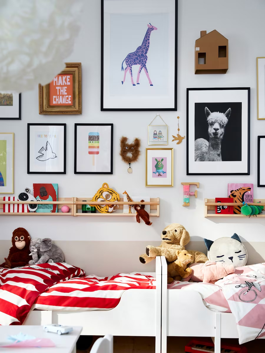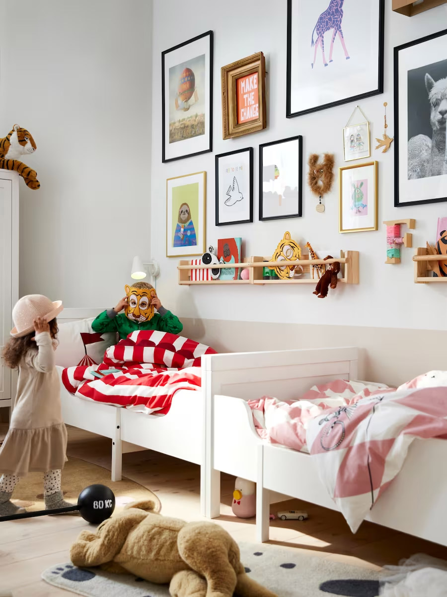 The extendable beds are identical but the different rugs and bed linen mark out two zones for two distinct personalities. The red and pink bed linen share the same colour family, so they work well together, keeping things calm and coordinated. Their circus theme adds a happy, playful touch, too.