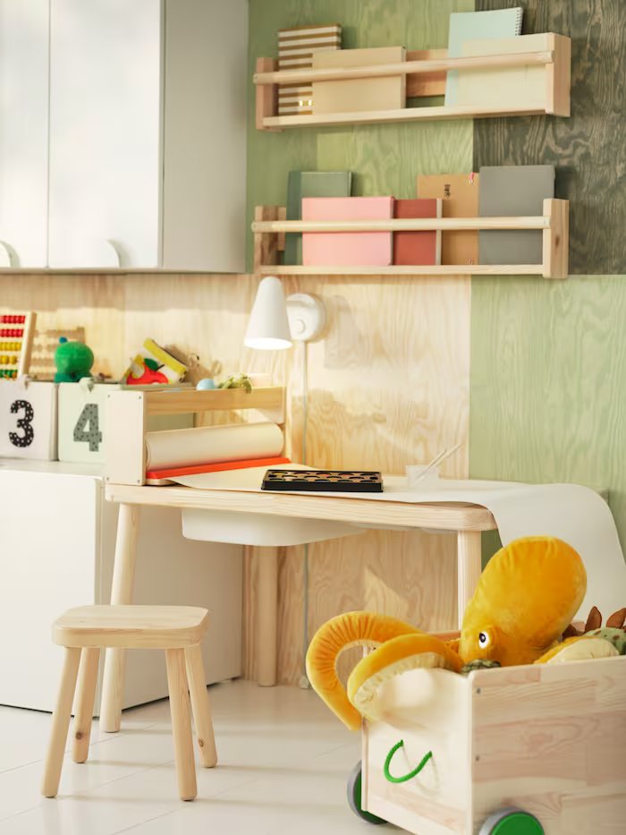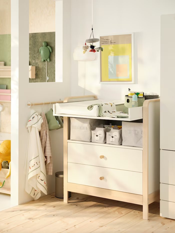 Keep baby feeling calm, comfortable and cared-for with a baby changing station where everything is in one easy-to-reach place. This one has hooks to hang linen or bags, a bin for rubbish, and a changing table with storage for nappies and clothing. And as it turns into a chest of drawers you can keep it when your baby grows.