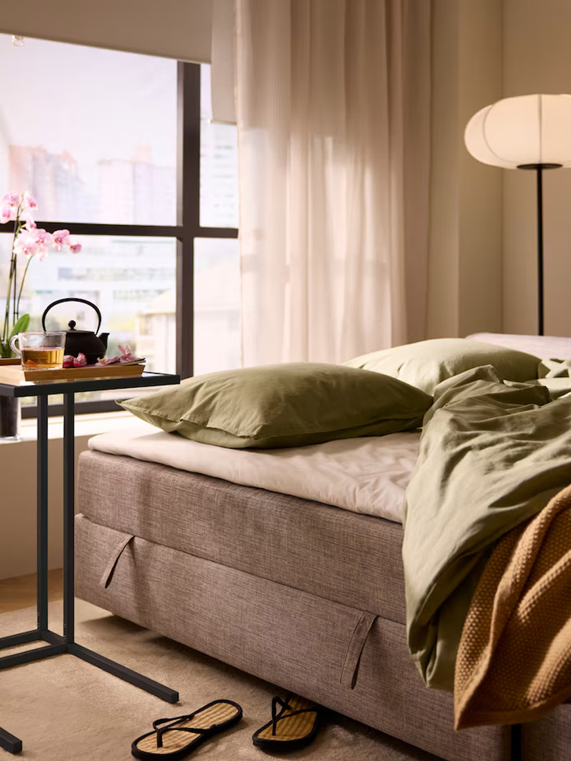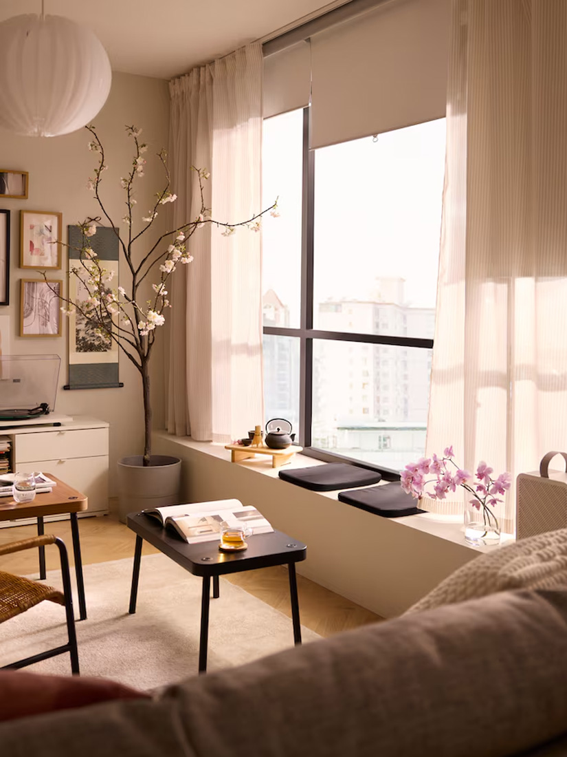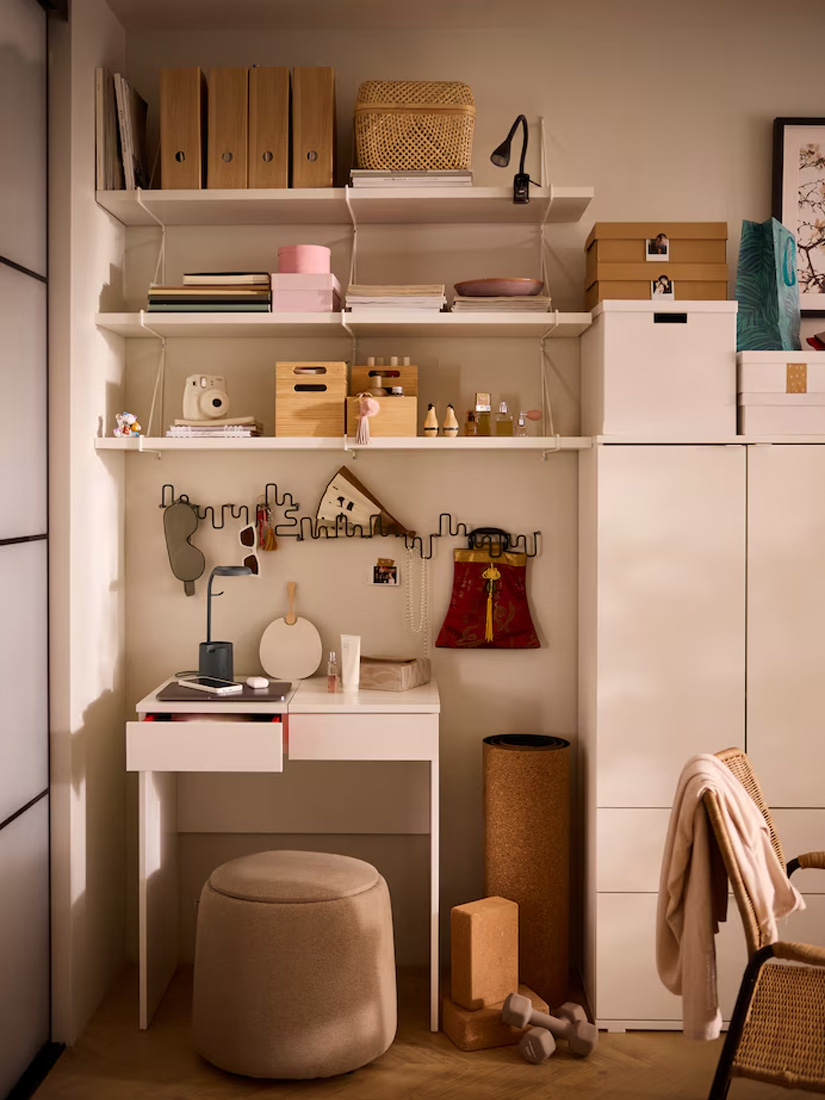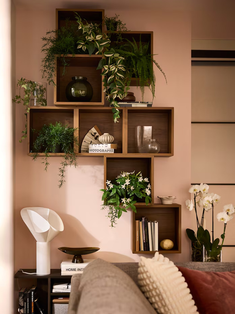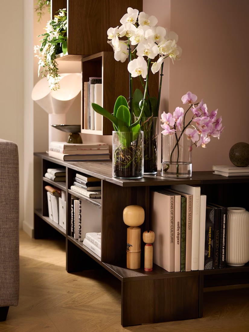 Here, cabinets and side tables create a sleek look that holds a pleasant mix of storage, display and deco. The EKET design is easy to build vertically, using the full height of the wall. The side tables cradling the outward corner become a natural focal point, ready to elevate whatever deserves some extra attention.