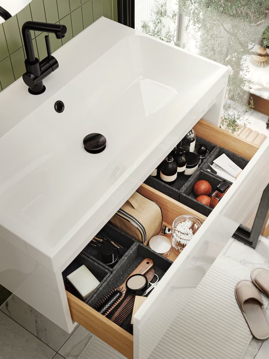 Enter this stylish and contemporary bathroom where everything is designed for your well-being. Adjust the dimmable light integrated in the mirror to feel more relaxed, knowing that everything is at hand thanks to the soft drawer organisers. Breathe in, breathe out, repeat.