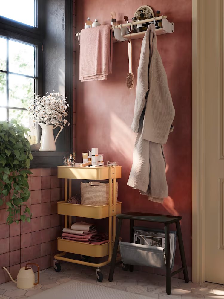 Big or small doesn't matter — with a variety of storage solutions across your bathroom you can turn it into something both charming and functional. A washstand in warm grey, supported by accessories in pink, wooden and earthy hues, gives this space an inviting atmosphere with a tidy and traditional look.