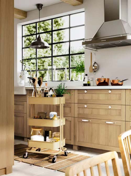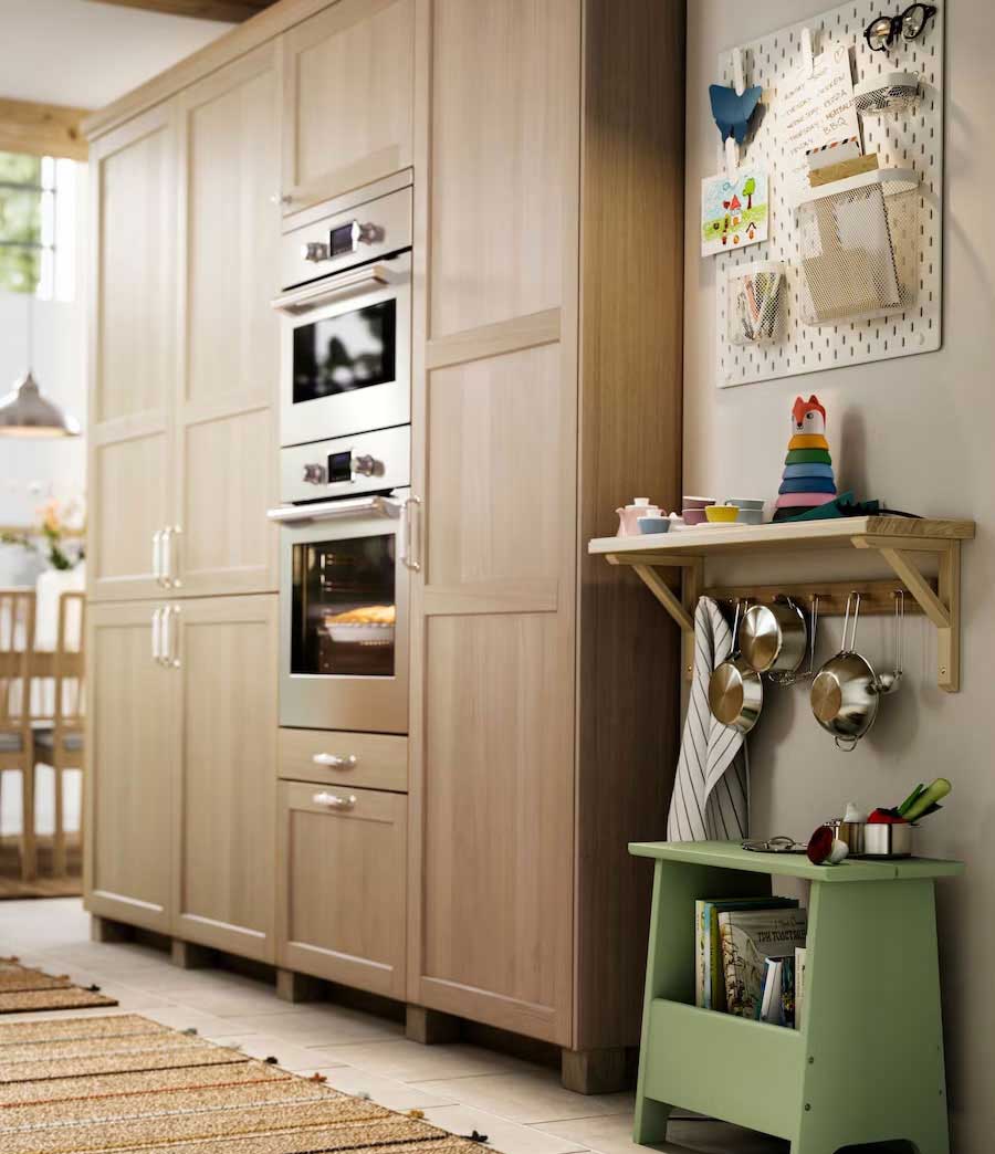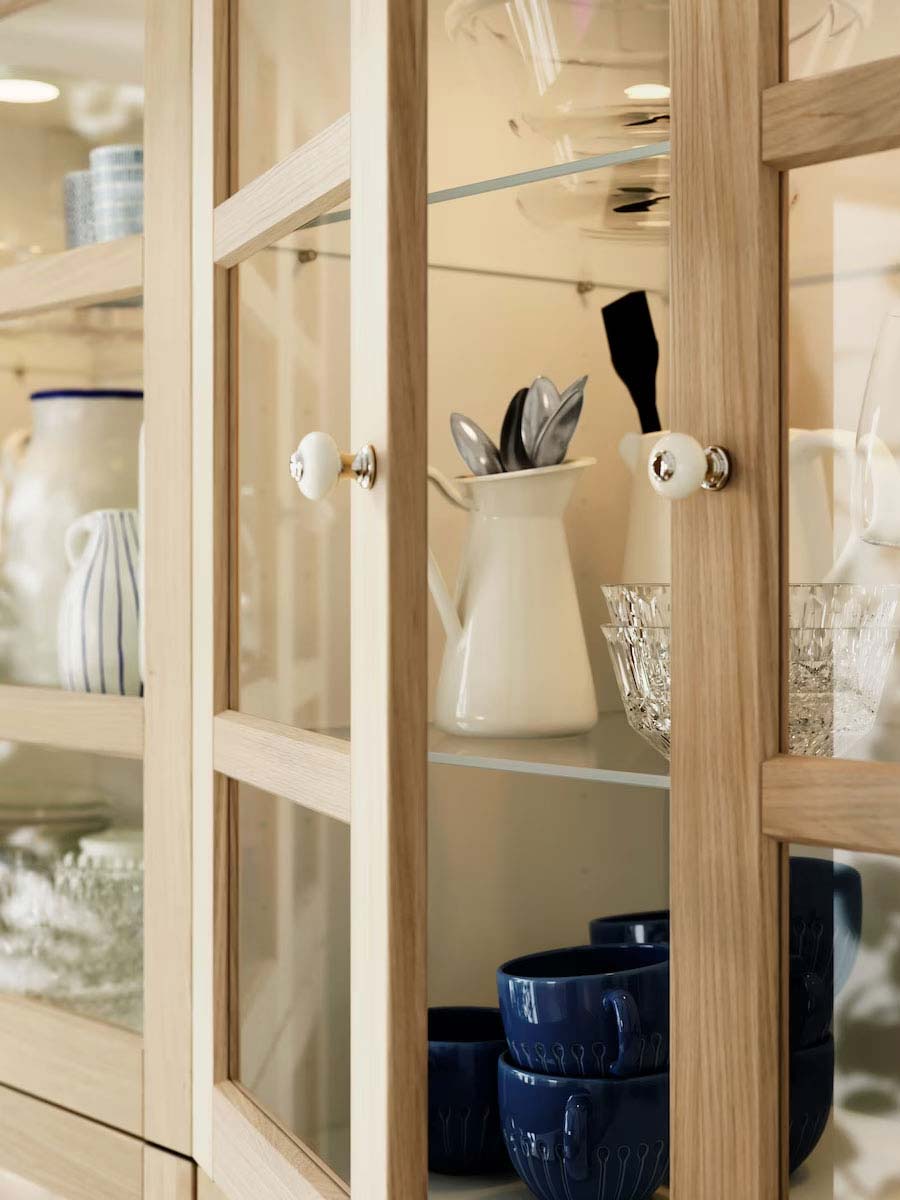 Warm, bright and inspired by a traditional style, this timeless kitchen in oak veneer makes you feel right at home. Its crafted and decorative look is enhanced by a conscious choice of details and materials, as well as beautiful textiles and kitchenware. This is the true heart of the home.