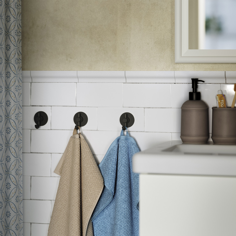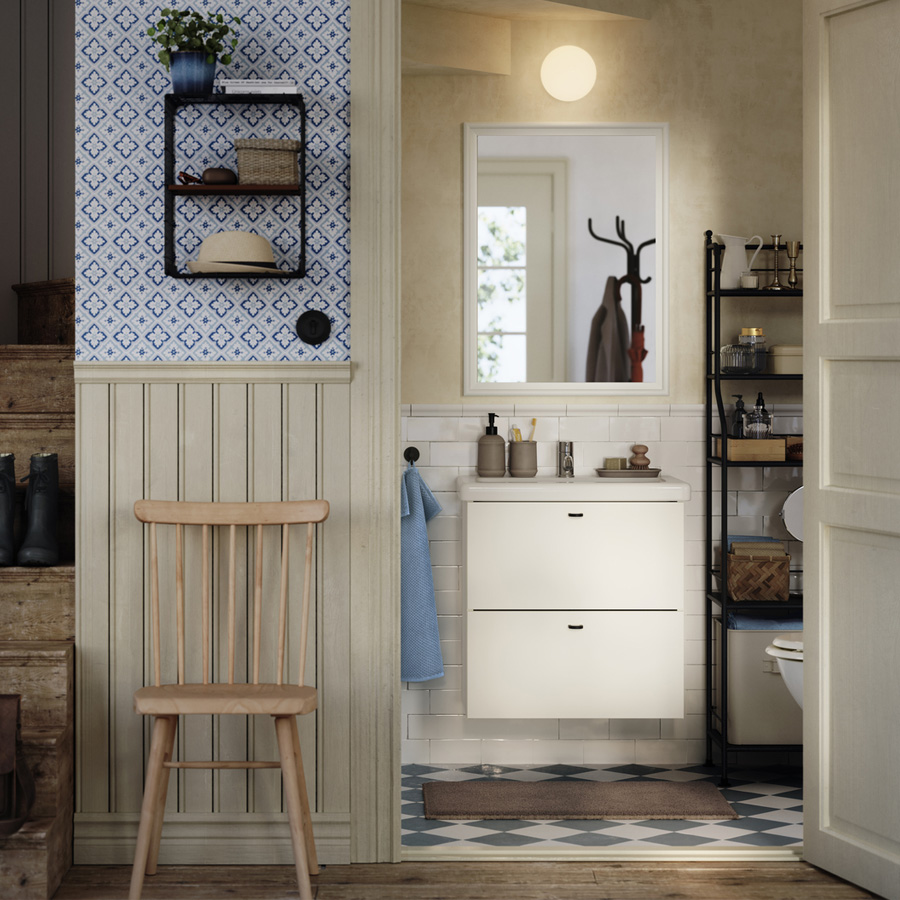 This white ENHET vanity unit is a base for routines and coordination. Its spacious drawers ensure there's plenty of convenient storage for effortless hygiene. Choosing matte black metal BORGHAMN handles adds to the room's old-fashioned feel. Stoneware accessories, a bevelled-edge mirror and finial-topped shelving give a handcrafted impression.