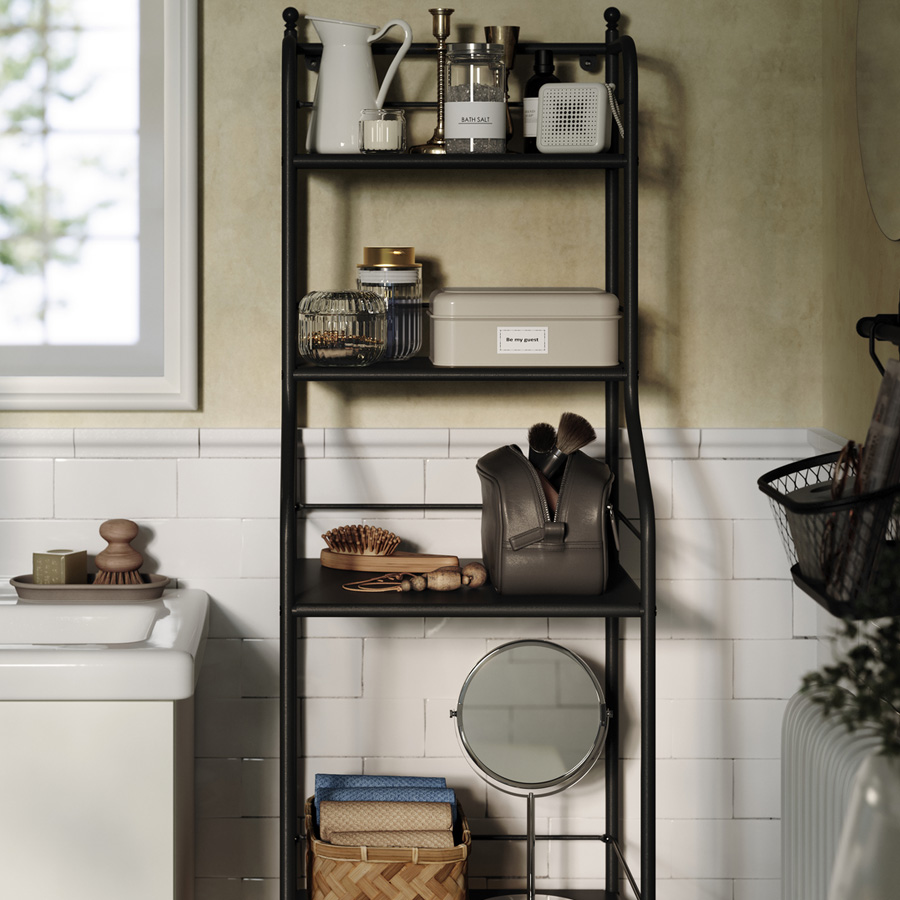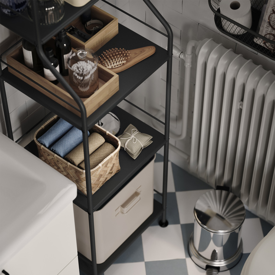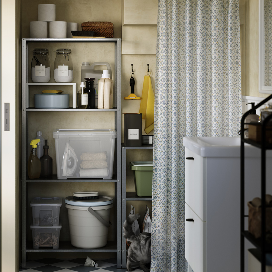 One of the most impactful small half bath ideas is the simplest. Add in sturdy, galvanised steel HYLLIS shelving units to hold cleaning supplies, towers of toilet paper and bulky essentials. Then hide it all by putting up a shower curtain rod and a shower curtain. Now the cat has privacy, too.
