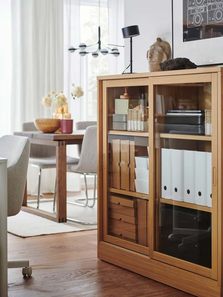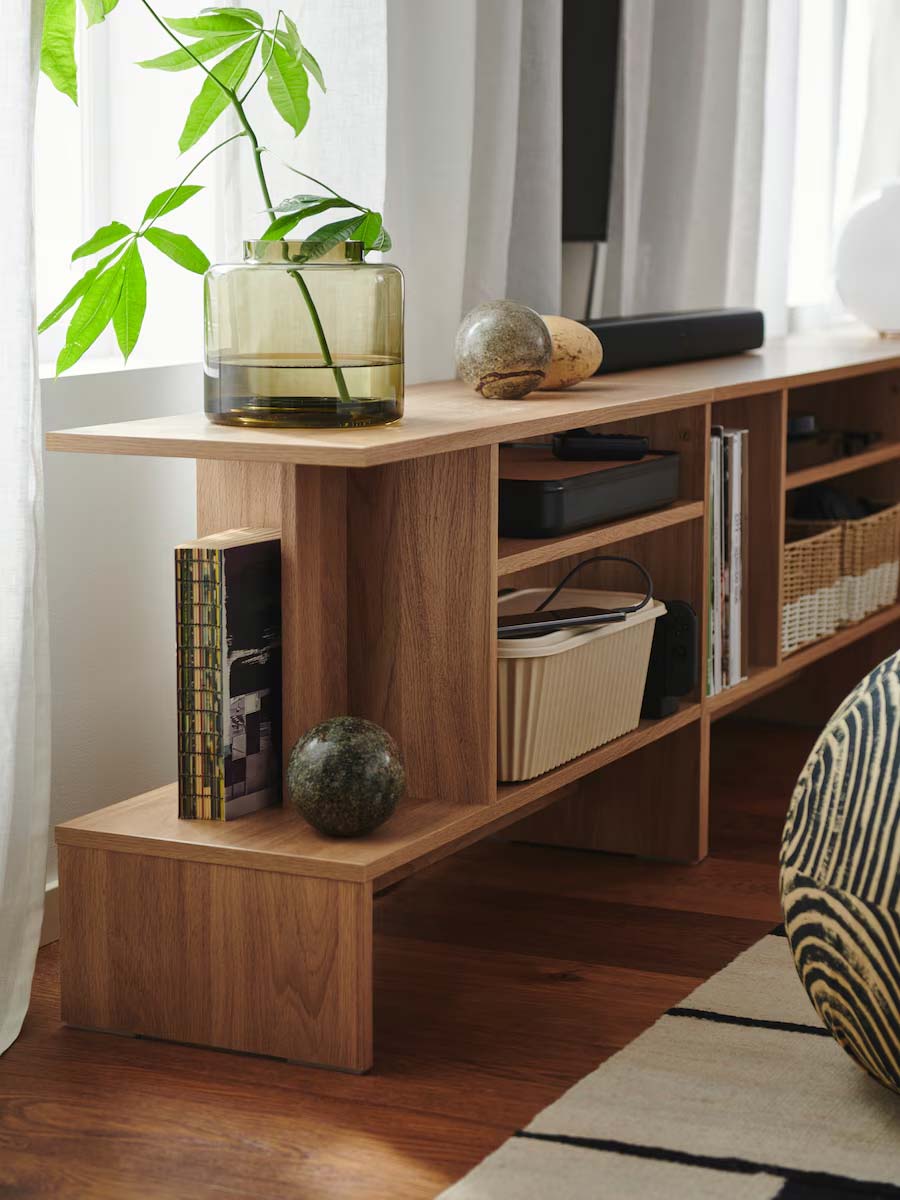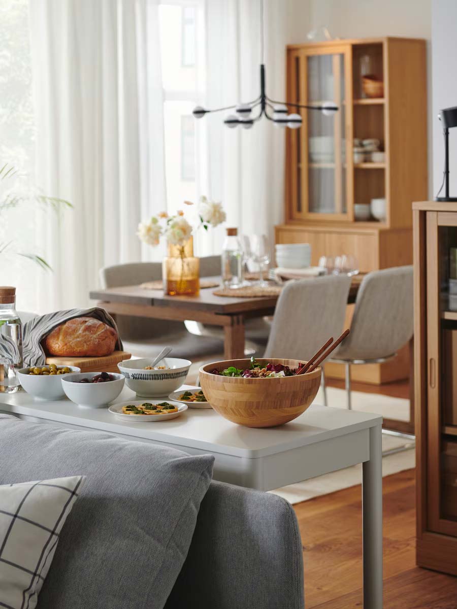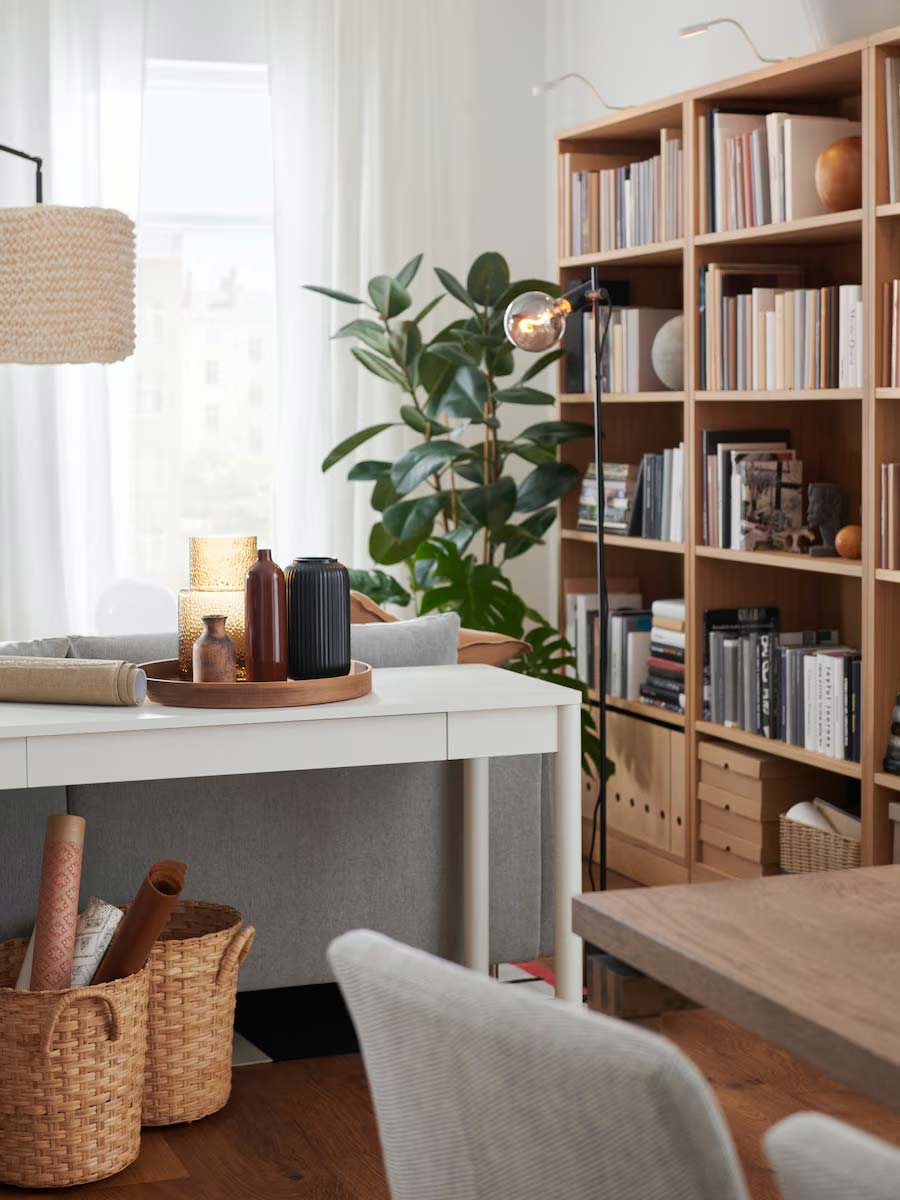 In this modern living space, the coordinated oak-finished storage furniture establishes a calm and solid foundation. The room’s heart, a white island, elegantly contrasts the oak’s density with its lightness, creating a cosy, versatile area.