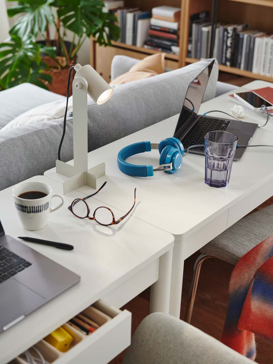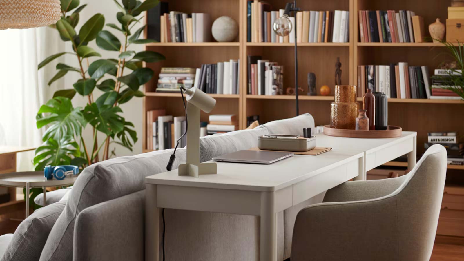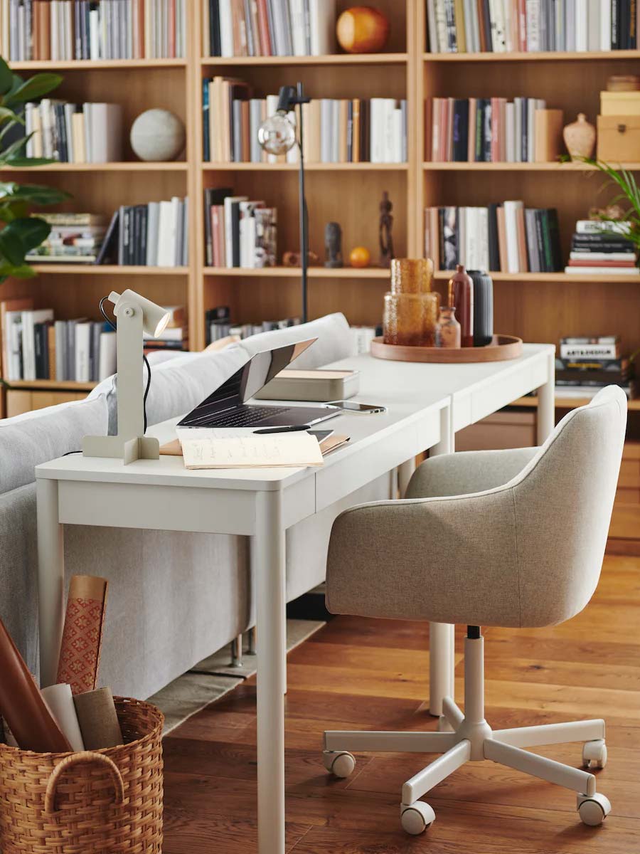 In this modern living space, the coordinated oak-finished storage furniture establishes a calm and solid foundation. The room’s heart, a white island, elegantly contrasts the oak’s density with its lightness, creating a cosy, versatile area.