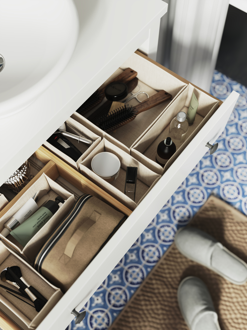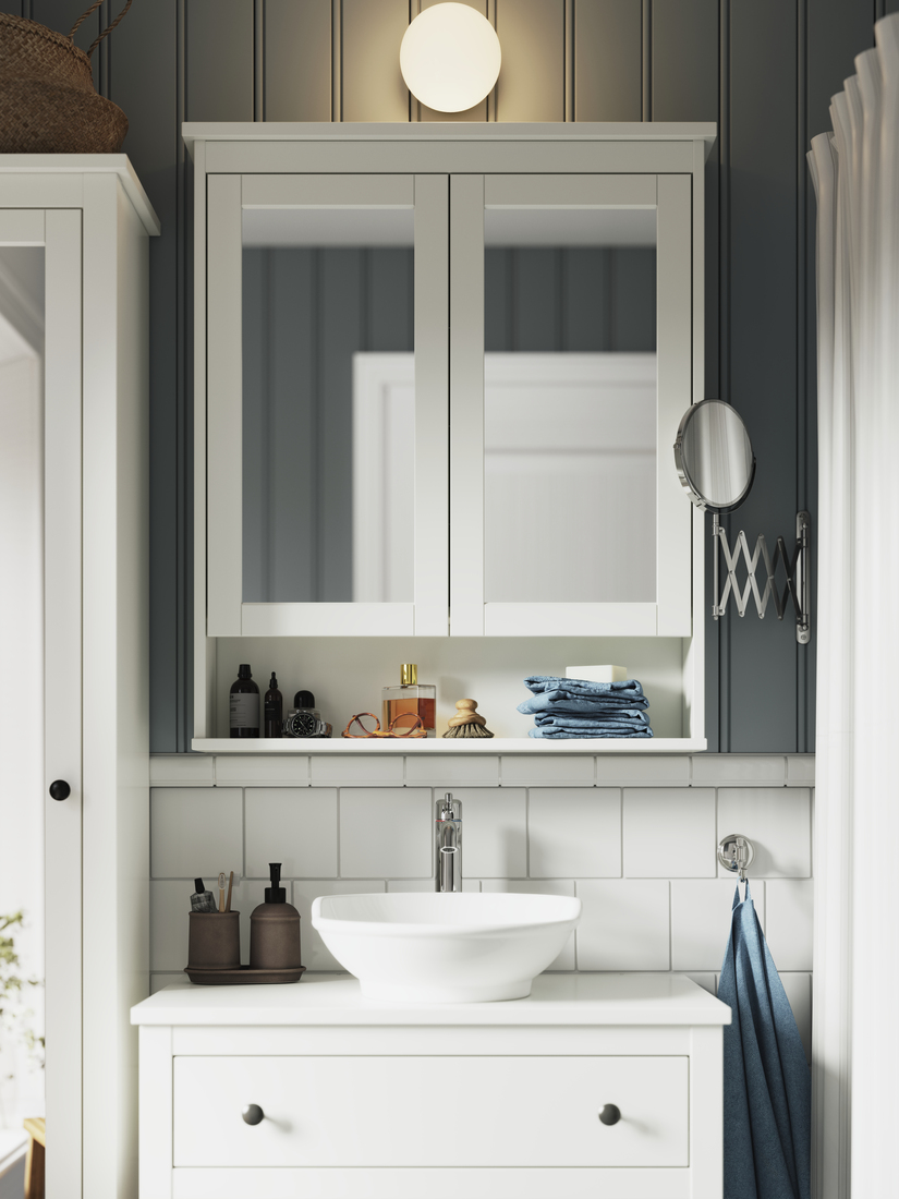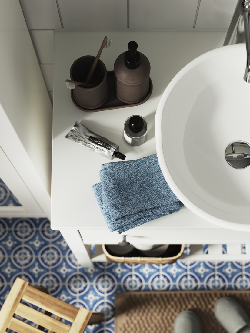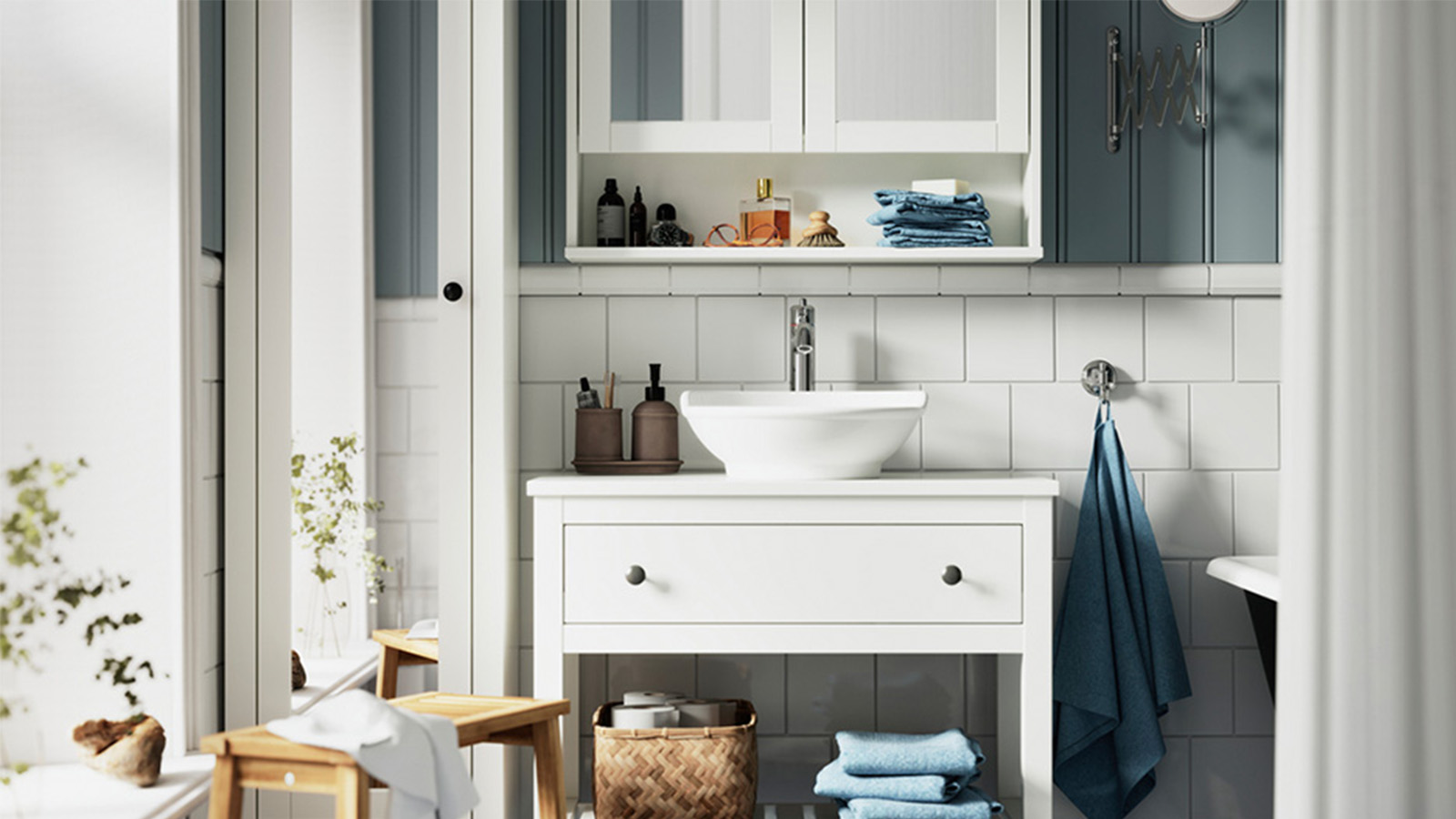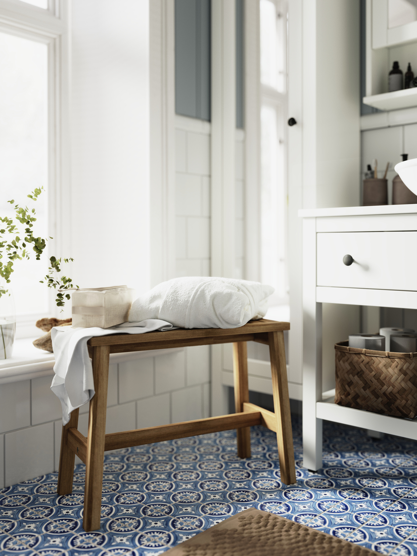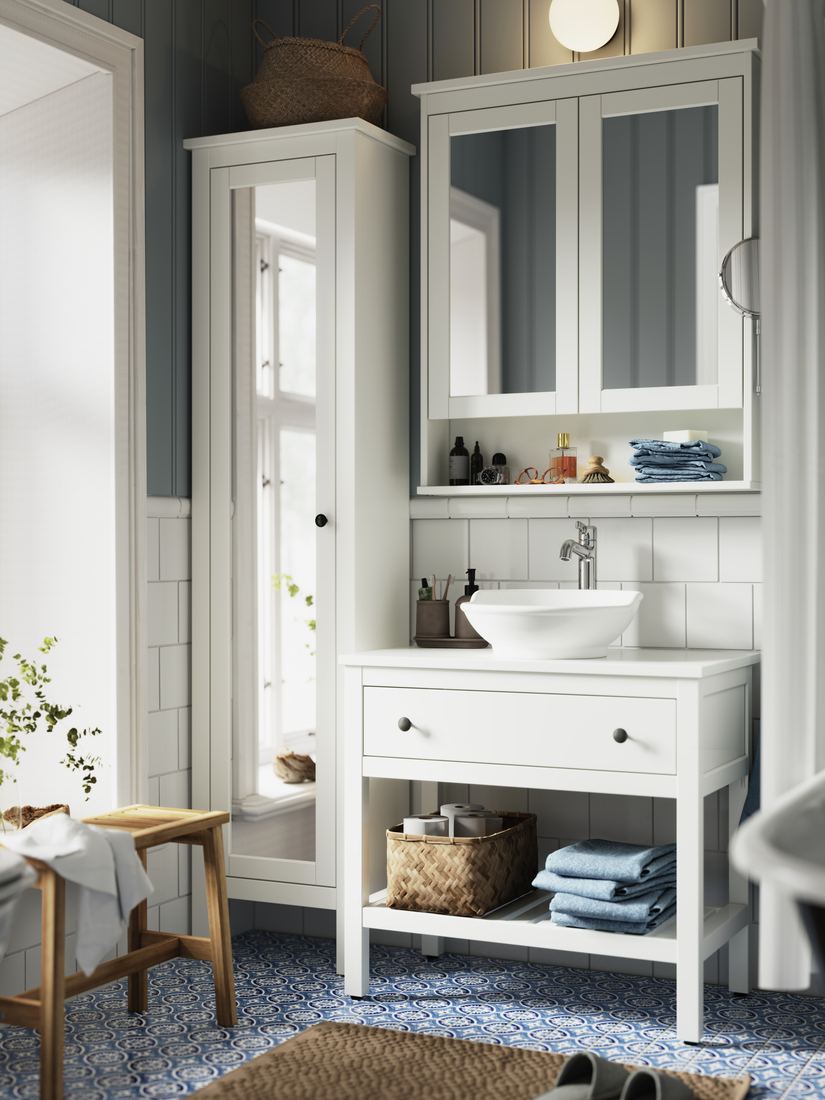 Inspired by classic Hamptons style interiors, this bright bathroom has a colour palette of fresh blue, white and light wood. Combining functionality and well-organised storage with casual comfort, the bathroom features HEMNES bathroom furniture with a simple, crafted look that feels effortlessly inviting.