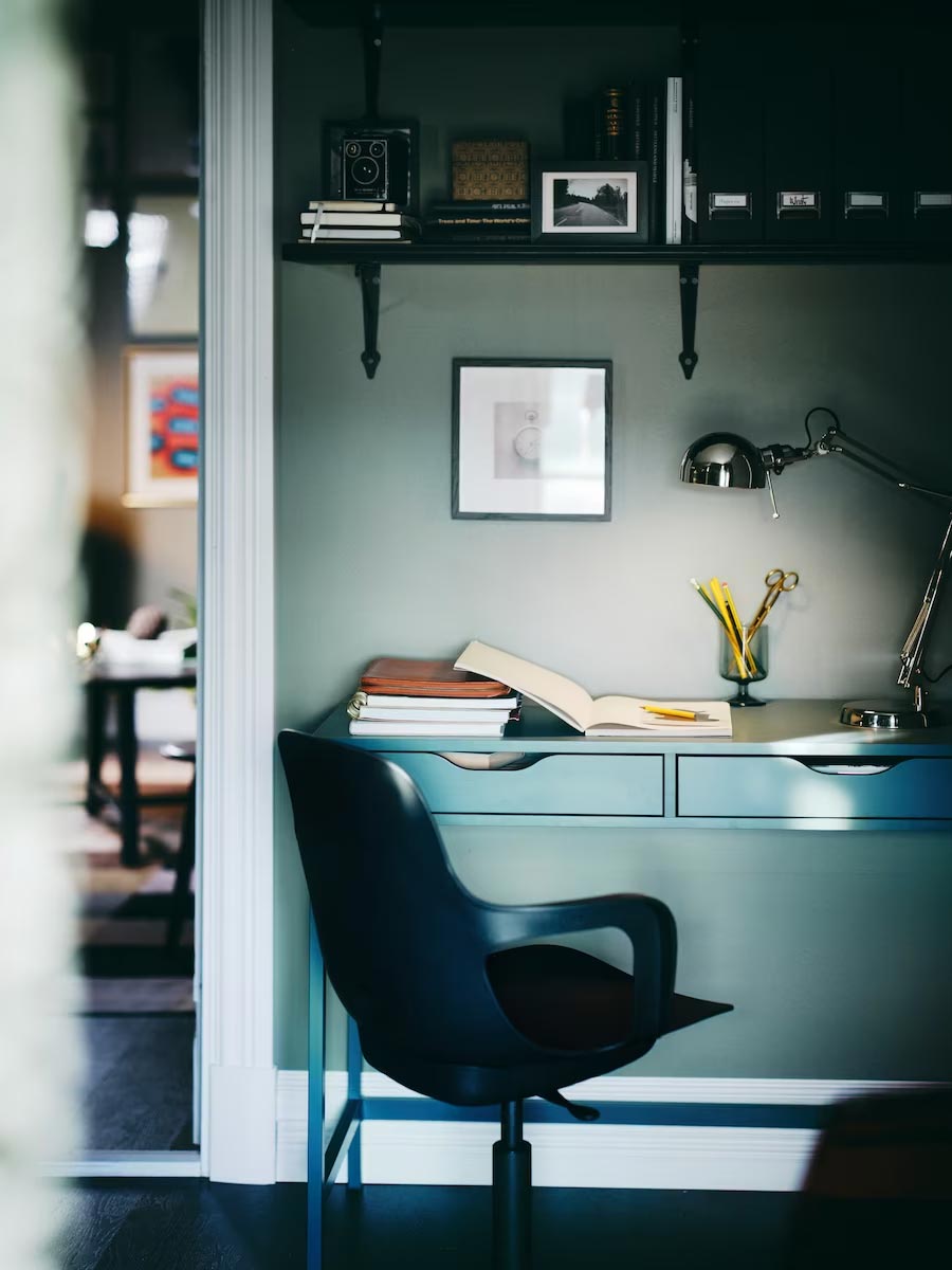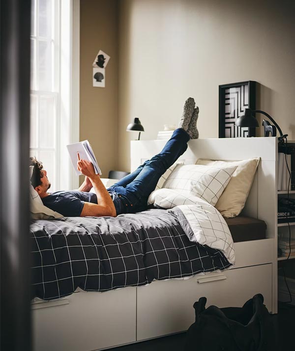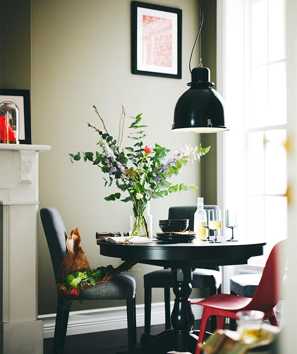 Both keen cooks who like to keep all their kitchen things separate, shelves, cupboard space, hooks and rails have all been split between the two of them. By carefully organising the space, they still have just enough room for a 2-seat breakfast table - ideal for a quick bite over the Sunday crossword.