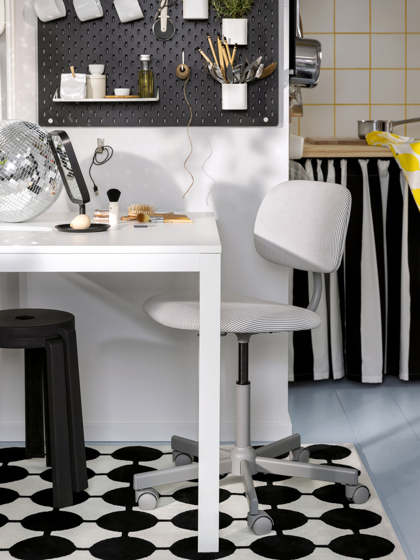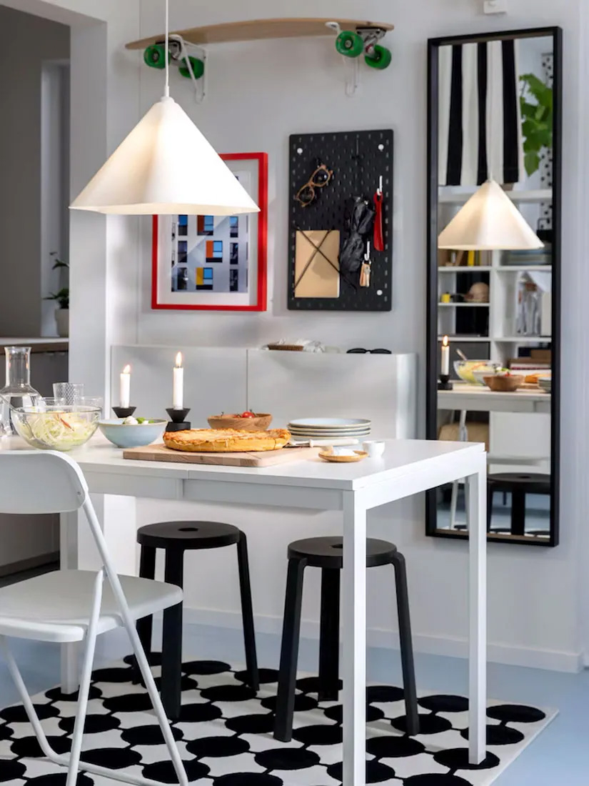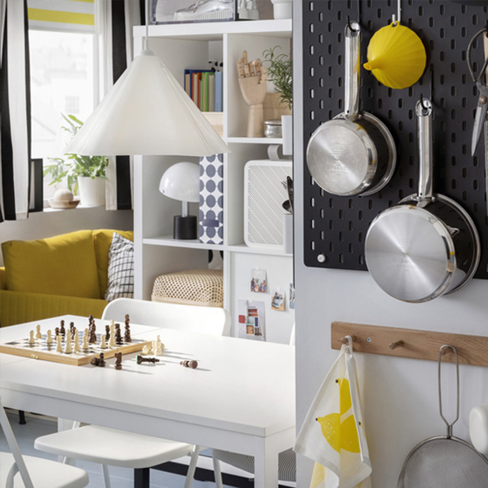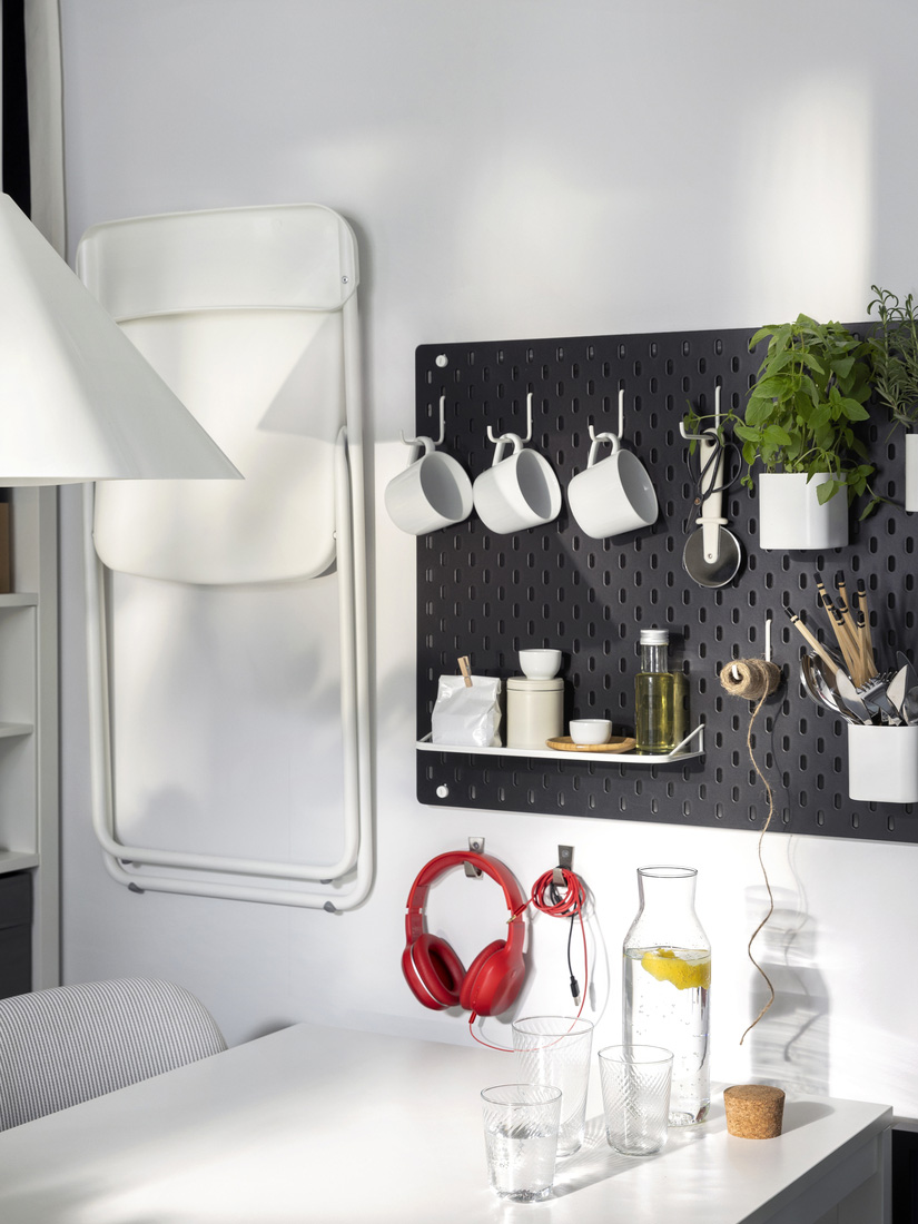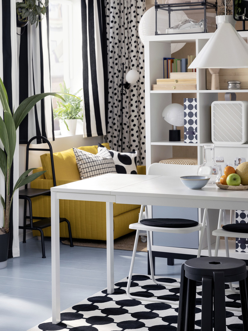 The KALLAX shelving unit provides lots of storage. It also divides the dining area from the living area and helps give the home a personal look. Complementing the extendable table, a VIHALS folding chair and stackable IBBARBO stools are easy to take out for guests and store away when they’ve gone. Flexible furniture, personalised storage, and creating a home that reflects you are the keys to this dining room.