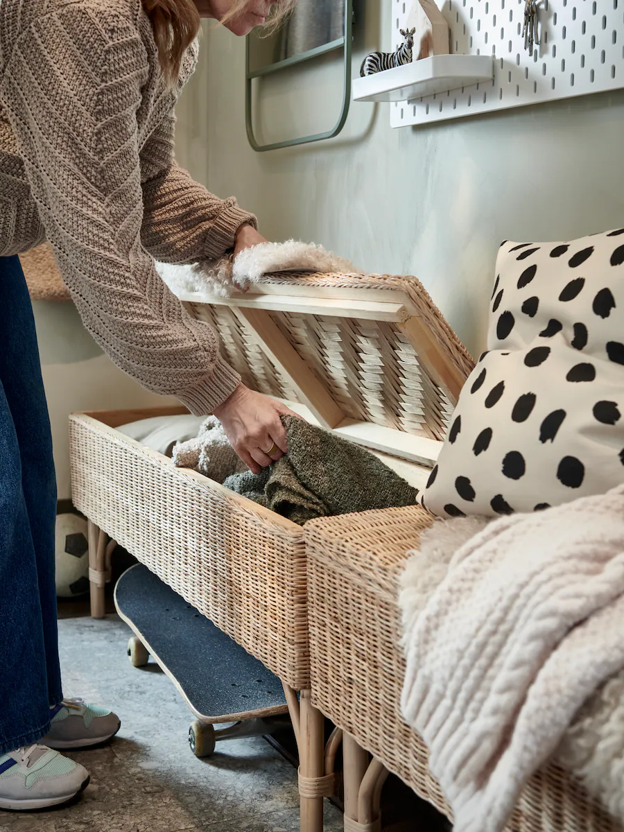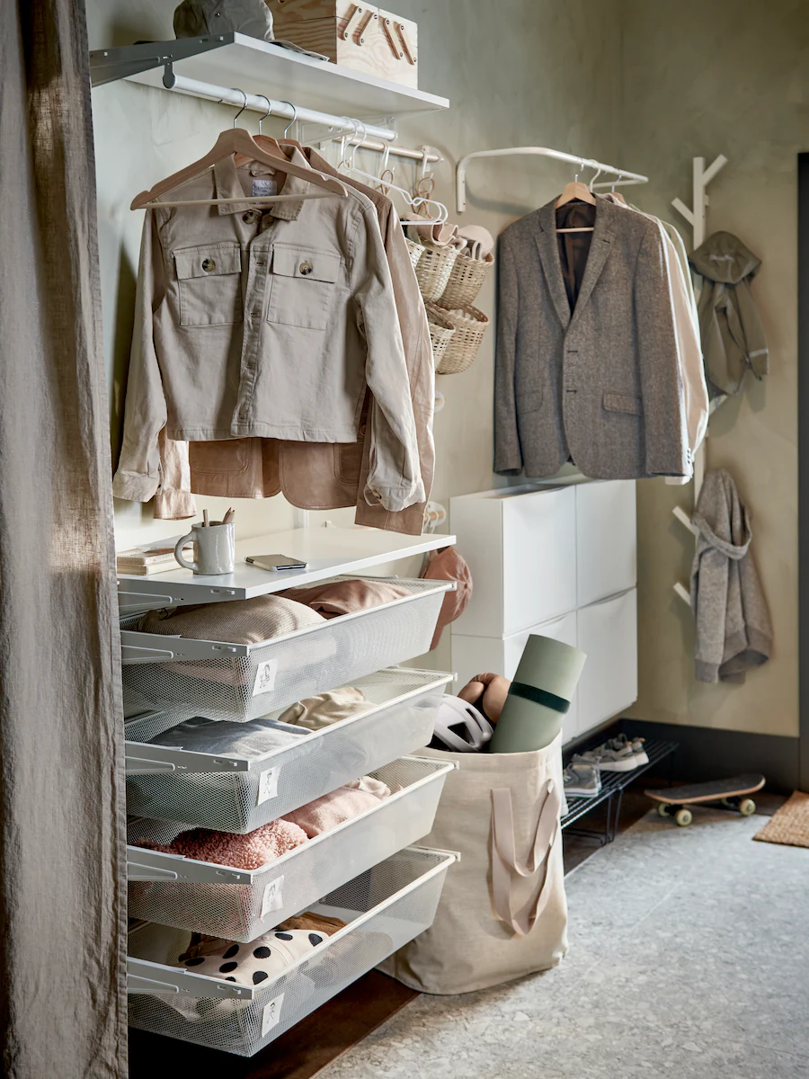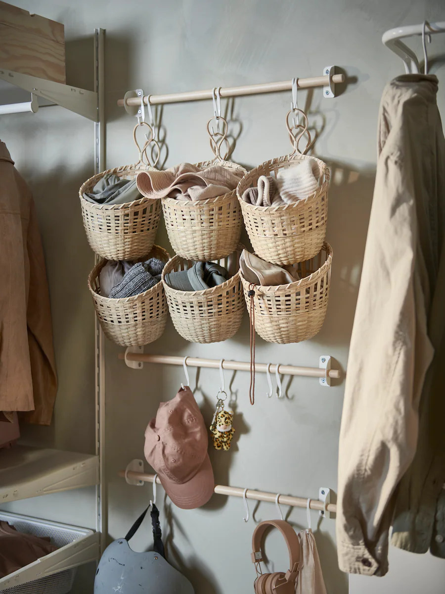 Pegboards in the hallway are great for keeping track of keys, glasses, chargers and other small things. Arrange hooks, holders, shelves, clips, containers and baskets as you like. Leaving some room for notes and schedules also helps your days flow nicely.