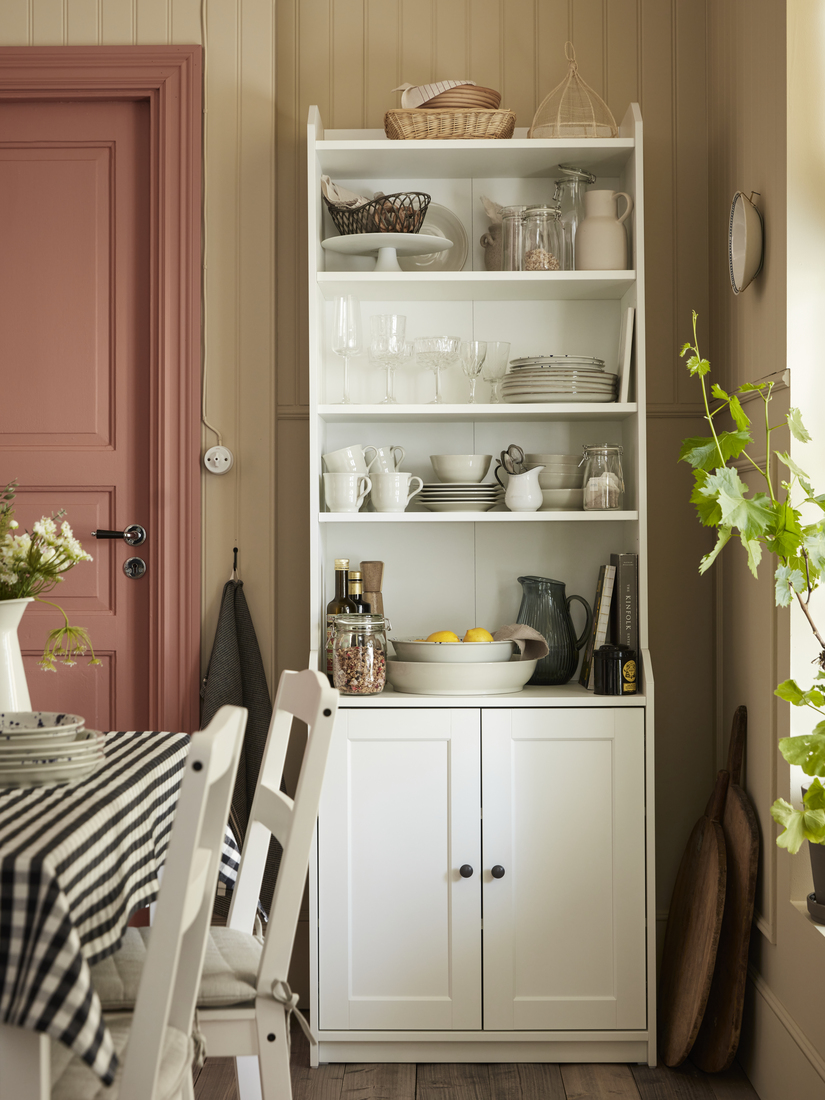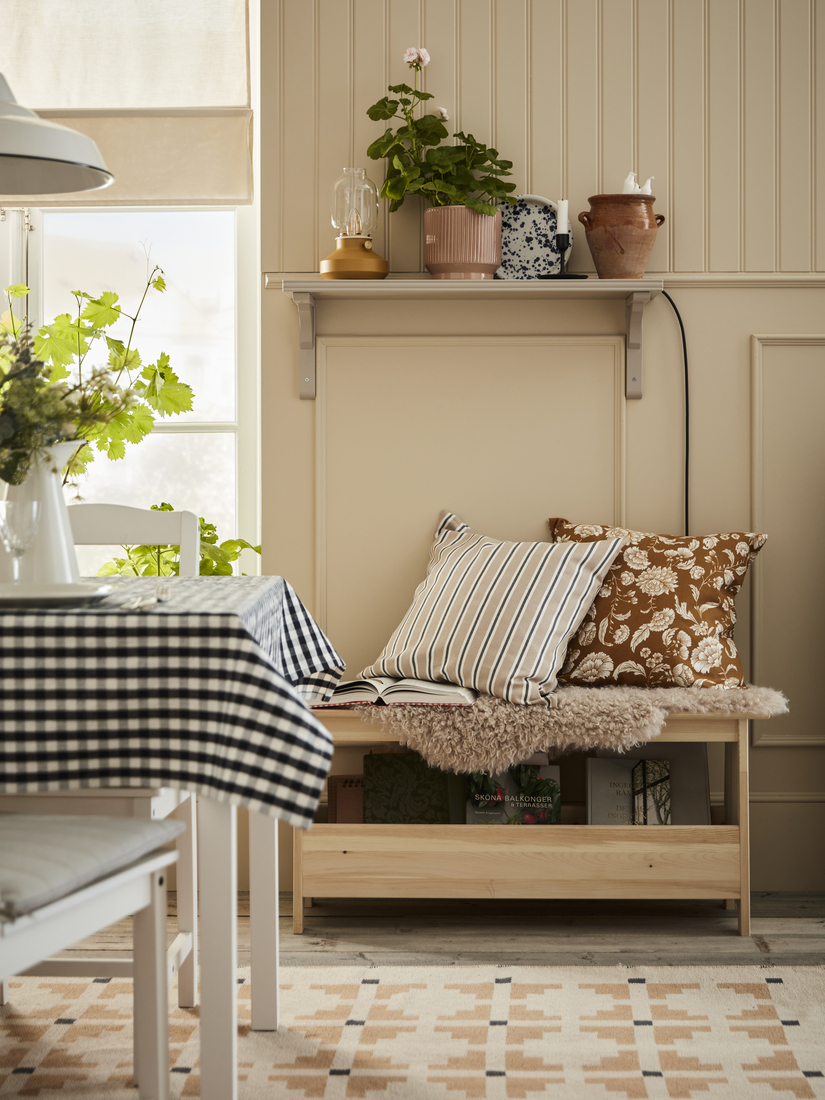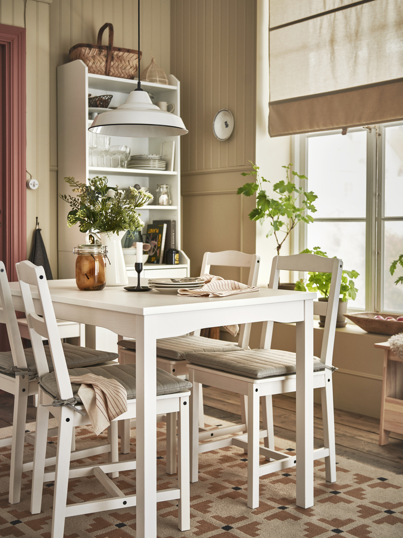 Simple and practical, the HAUGA table, chairs and high cabinet match perfectly, adding to the calm feeling. The TRETTIOEN pendant lamp, too, combines classic style with function, helping everyone to see and appreciate what’s on the table. With pretty flowers and NORDVIKEN chair pads for more seating comfort, this is a dining area where every day feels a bit better.