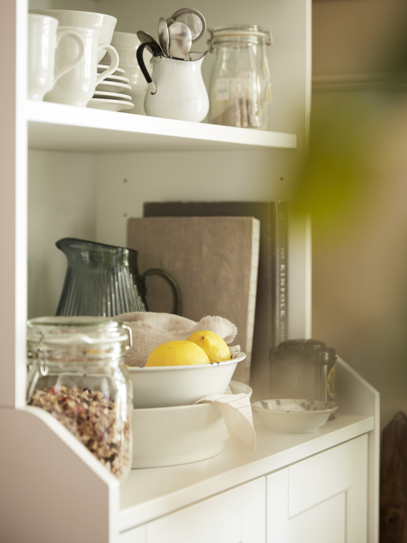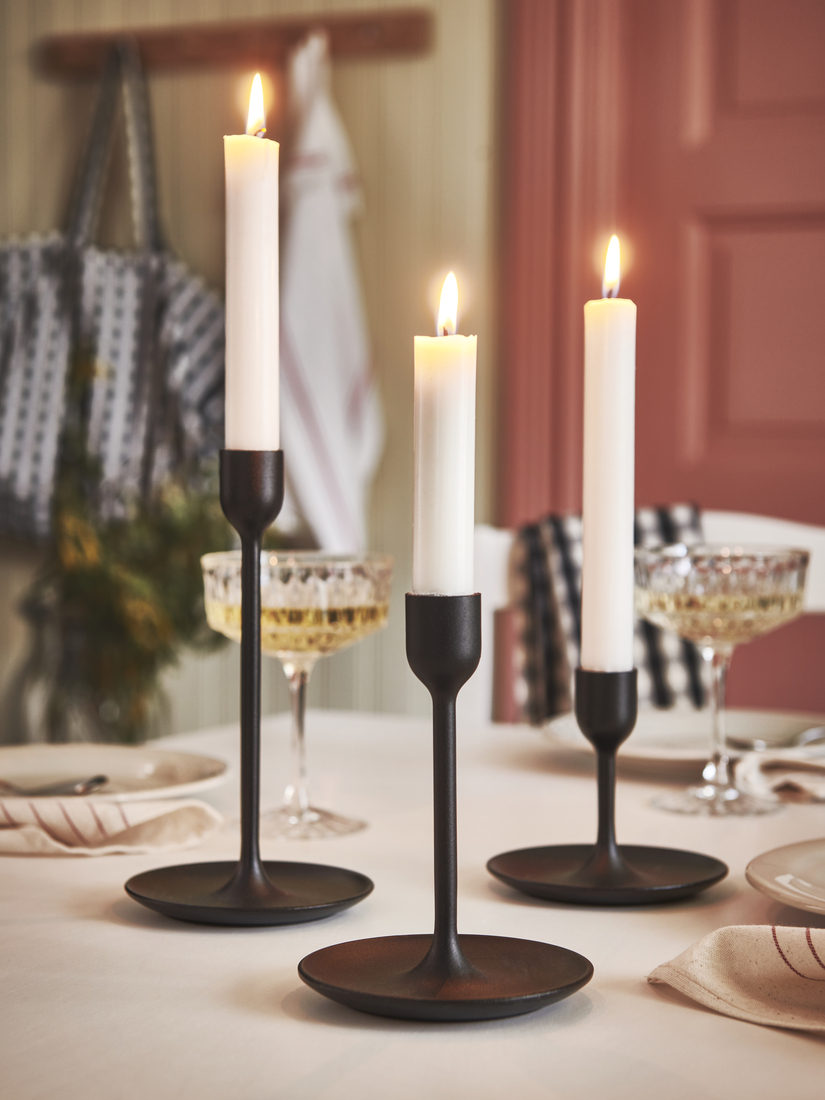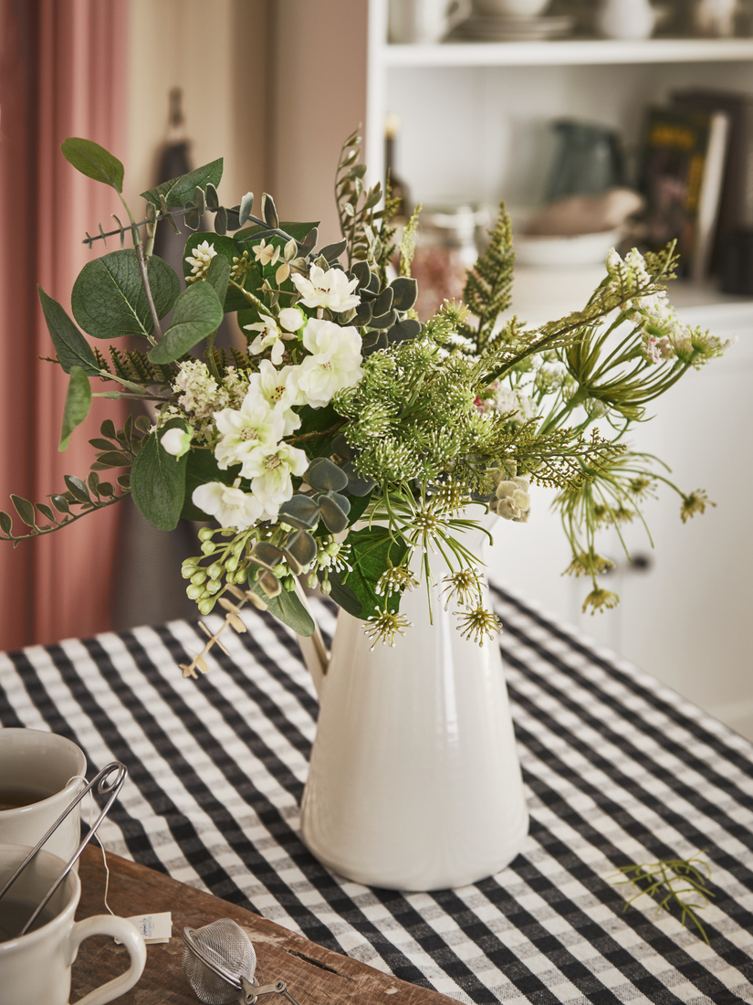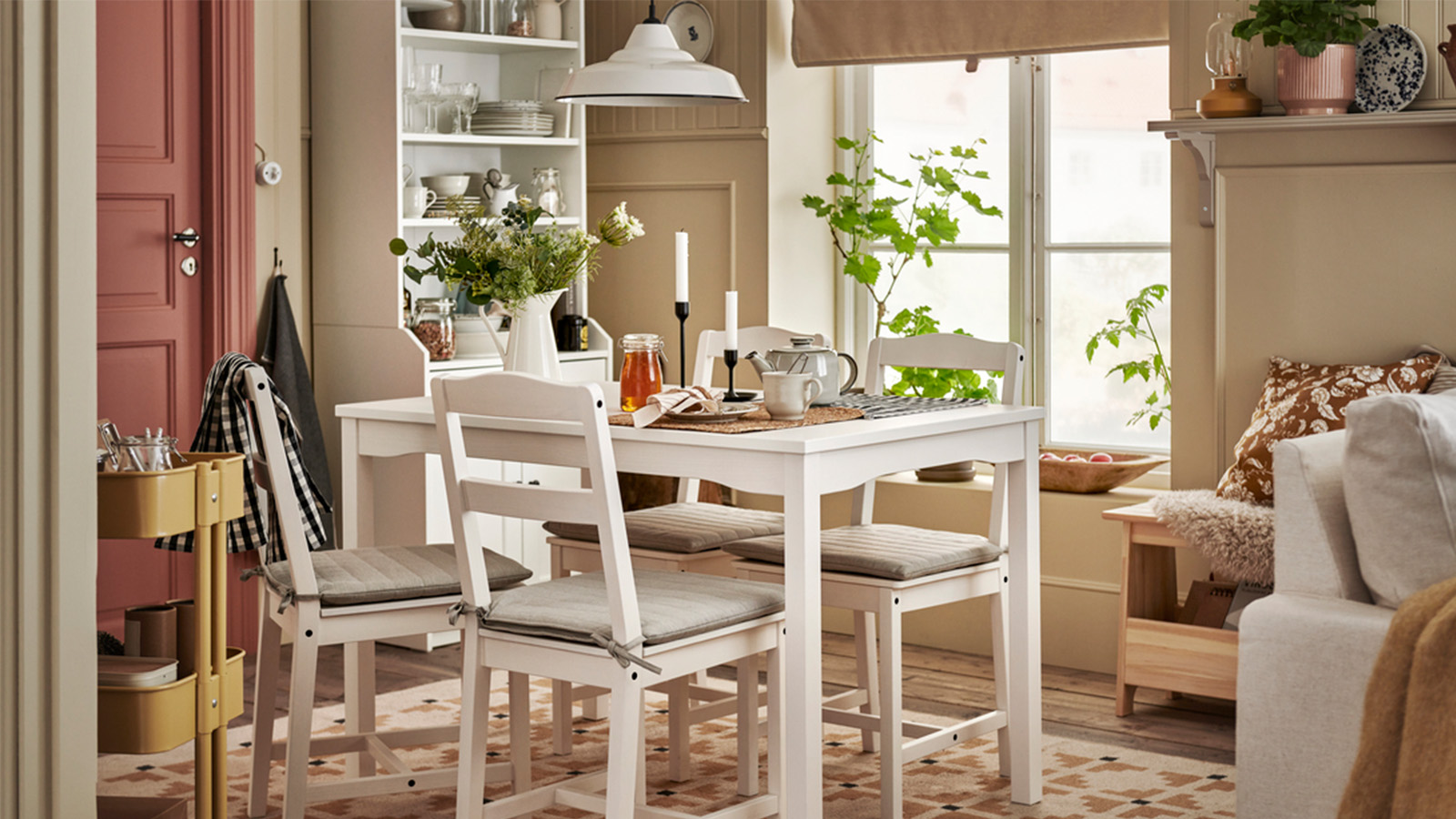 Simple and practical, the HAUGA table, chairs and high cabinet match perfectly, adding to the calm feeling. The TRETTIOEN pendant lamp, too, combines classic style with function, helping everyone to see and appreciate what’s on the table. With pretty flowers and NORDVIKEN chair pads for more seating comfort, this is a dining area where every day feels a bit better.