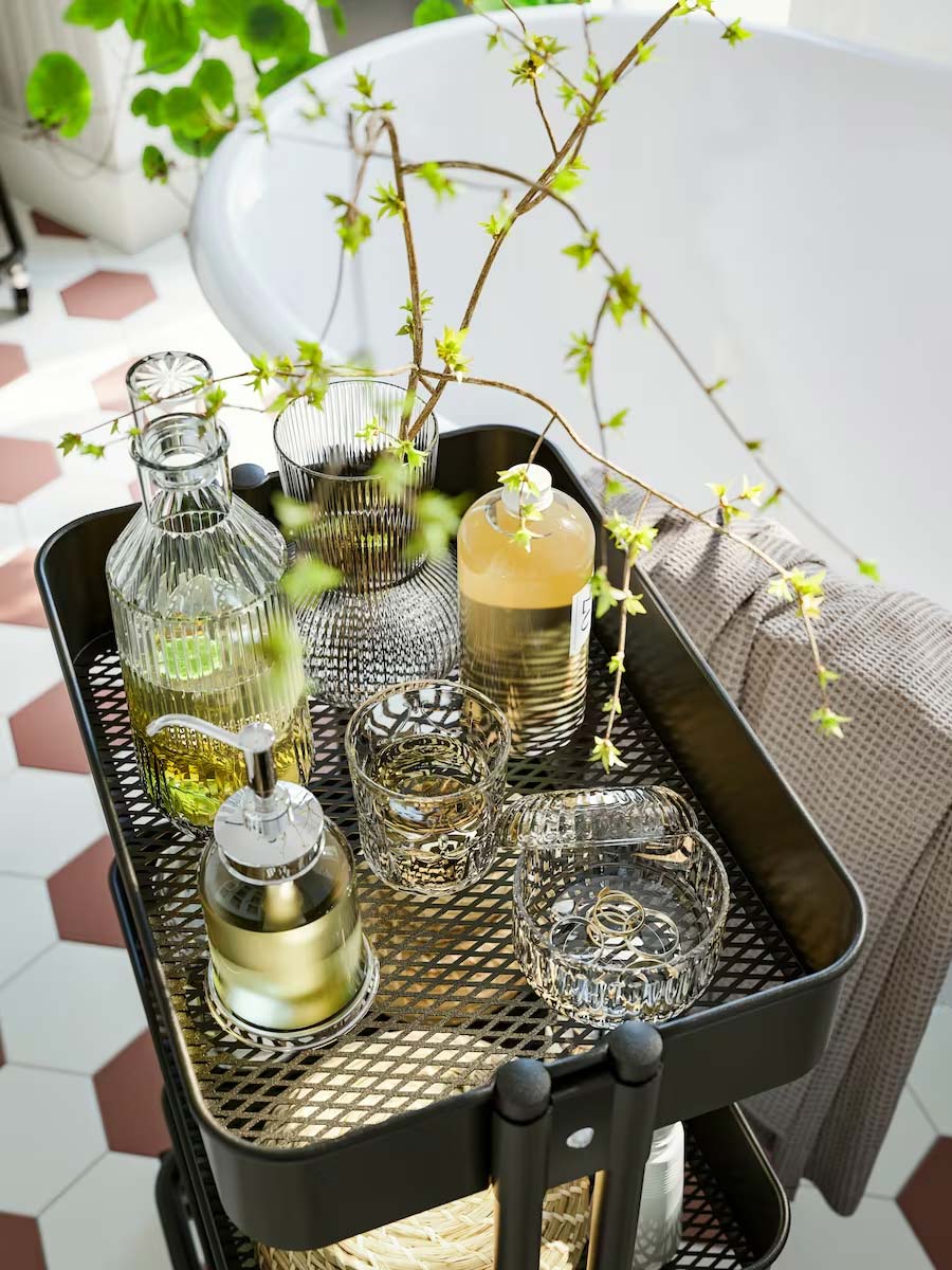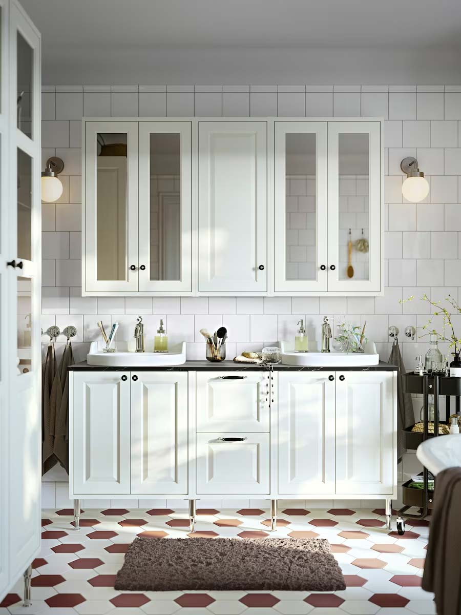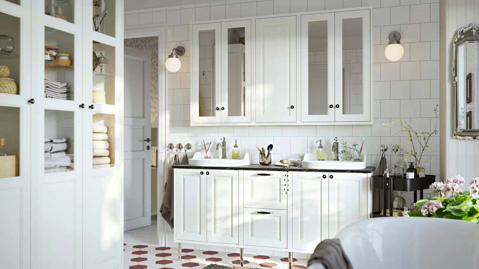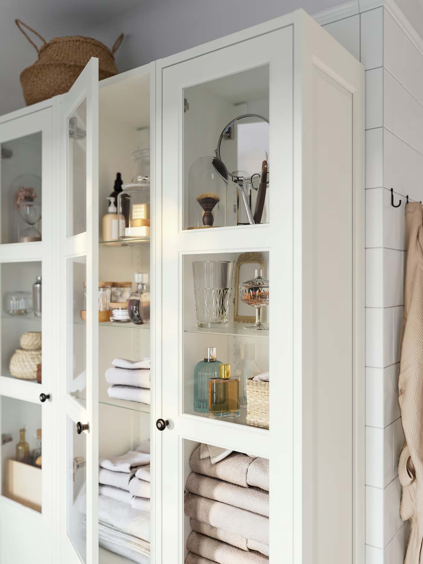The high cabinet is the hero of this bathroom, with its fine details like the bevelled panels, the stainless steel legs and the matte black knobs. Add your personal touch by showcasing your favourite objects on the shelves, and keep the rest of the bathroom essentials in order.