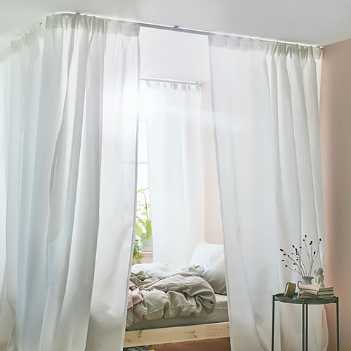 It is so flexible that the VIDGA curtain hanging system makes it easy to hang curtains over windows, on walls, around corners, and even as room dividers around a bed. Simply connect curtain rods together or cut to the desired length with a hacksaw. Read our VIDGA assembly instruction to make a personalized curtain solution step by step.