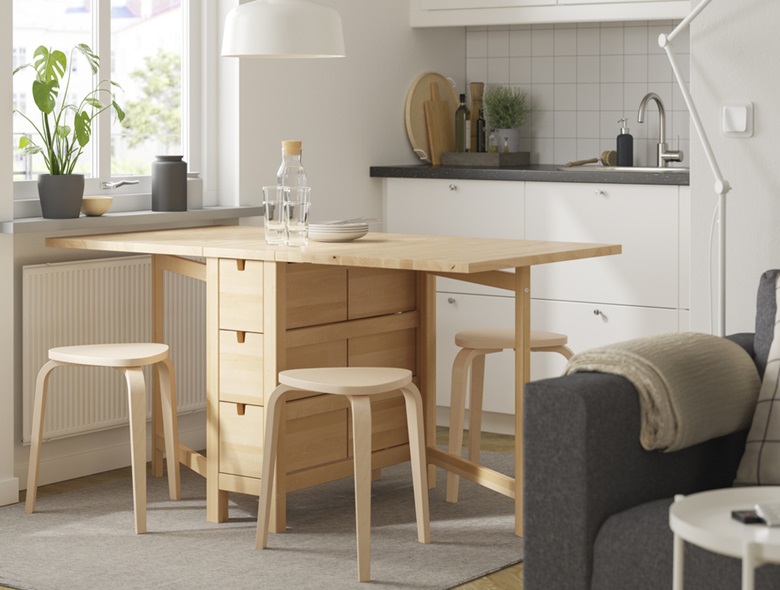The VIHALS drop-leaf table has a simple, straightforward design that offers great value for money and blends seamlessly into any home style. You can also adjust the drop-leaf panel as needed and store the folding chairs in the compartment under the table.