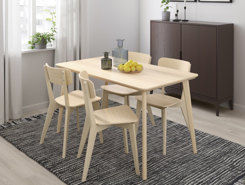 The NÄSINGE dining table features a wood veneer tabletop and chamfered solid wood legs, combining a grounded look with thoughtful detailing.
