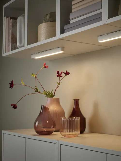 Put up energy-saving spotlights to highlight your favorite collections and add life to your living room and bedroom. Integrated lighting for your wardrobe, cabinets or shelves means less time searching for stuff, and some types also help you give the room a cosier atmosphere. The IKEA range has options for many areas of your home, including your kitchen and bathroom.