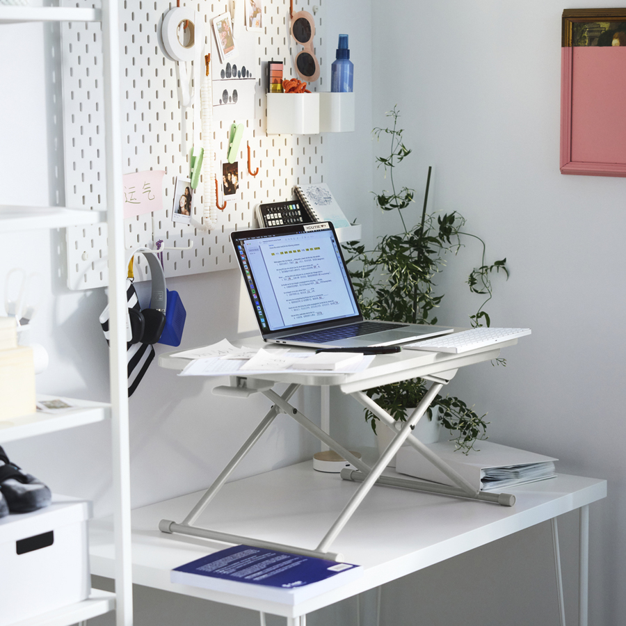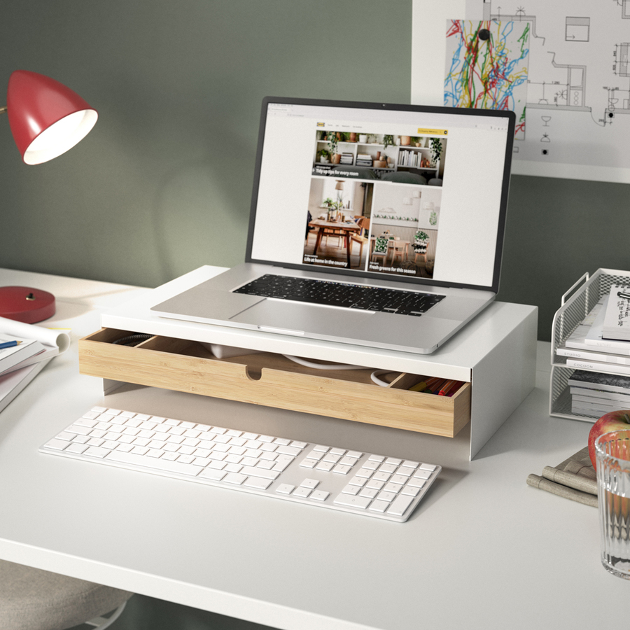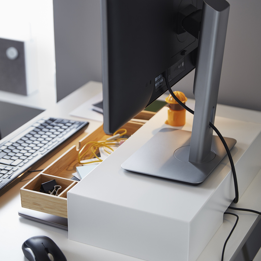 If you place your screen at the correct height, you relieve strain on your neck and shoulders. And a VATTENKAR laptop/monitor stand or an ELLOVEN monitor stand with drawer even give you extra storage, too. The ELLOVEN stand has a solid back but with a little opening in it for cables so you can keep things tidy.