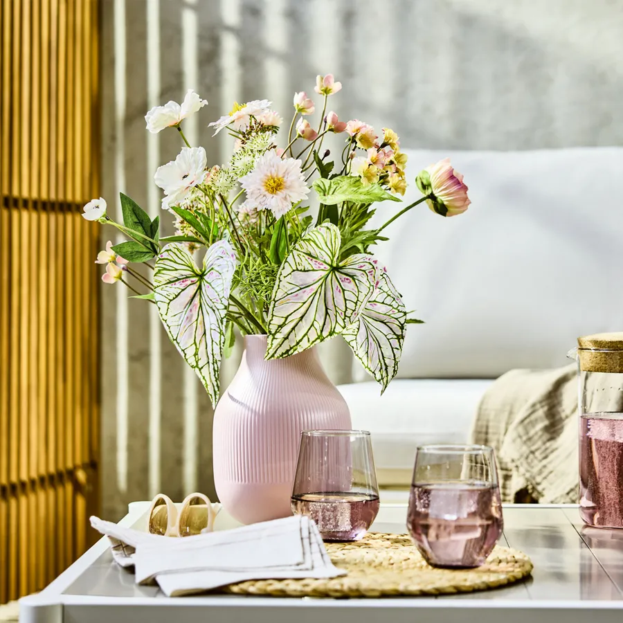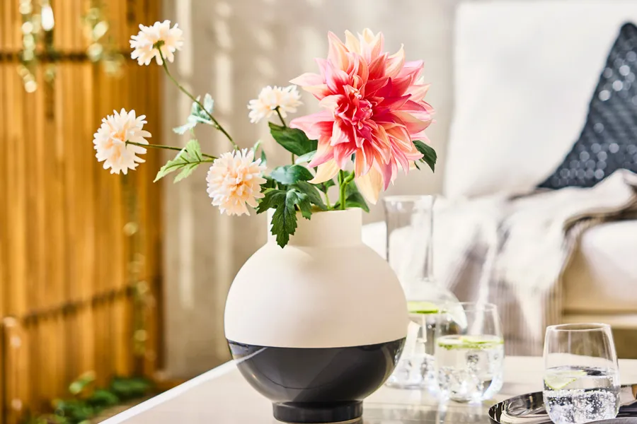 A single pink dahlia, styled in different ways, effortlessly creates a romantic, fresh, or modern ambiance. Adjust the flower arrangement to your liking – experiment with height and angles to give your home a different look every day.