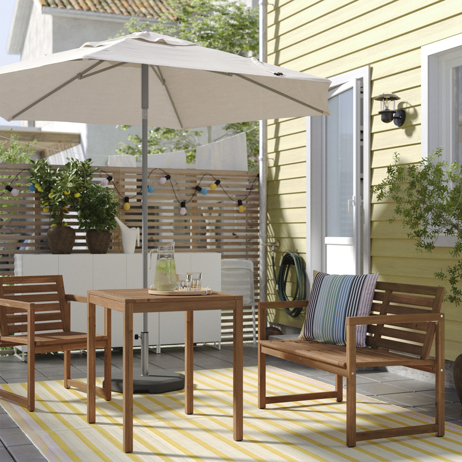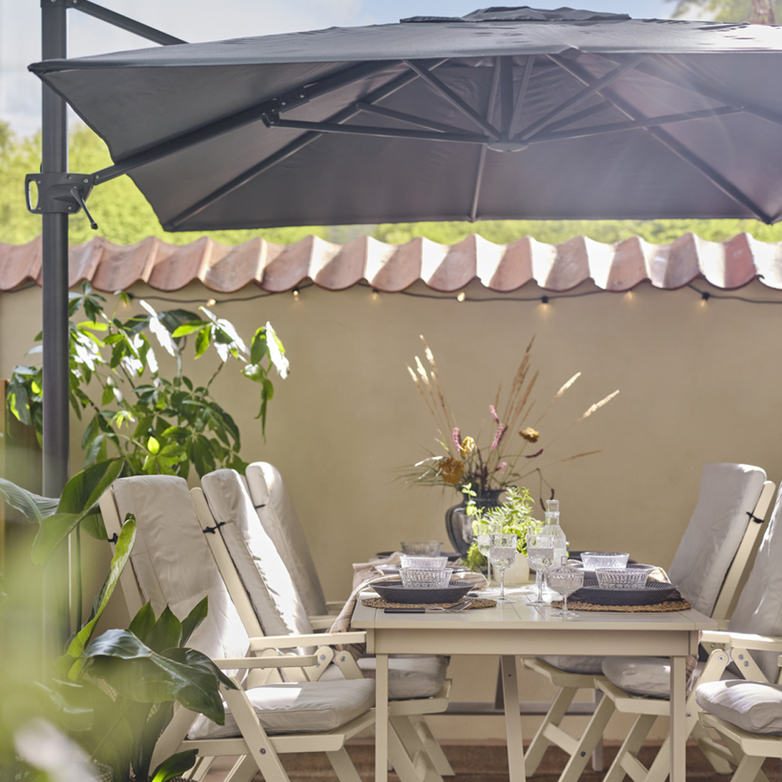 Sunshine and summer breeze are wonderful, especially if you're relaxing in the cool shade under one of our UV- and wind-blocking parasols (or gazebos), which blocks 98% of the UV rays and has air vents that reduces wind pressure and allows heat to circulate. We have many shapes and sizes, including big hanging parasols that give you more space underneath.