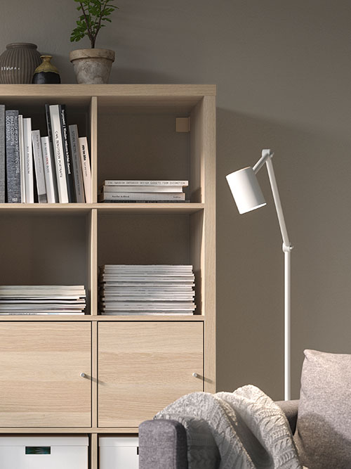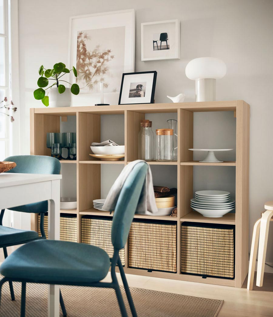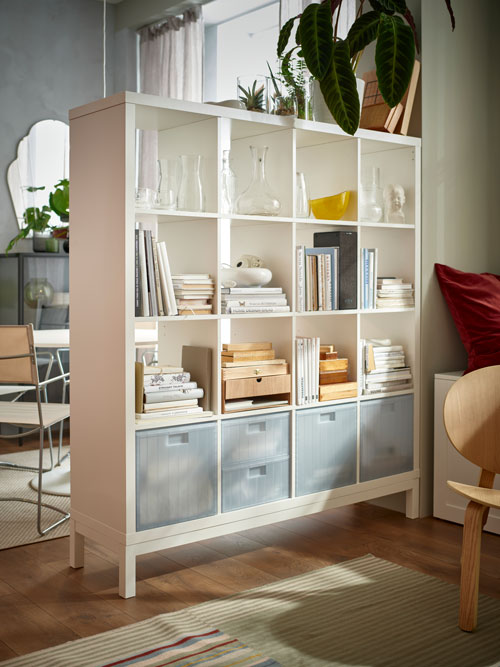 The KALLAX shelving system allows for both showcasing collectibles and hiding miscellaneous items.
