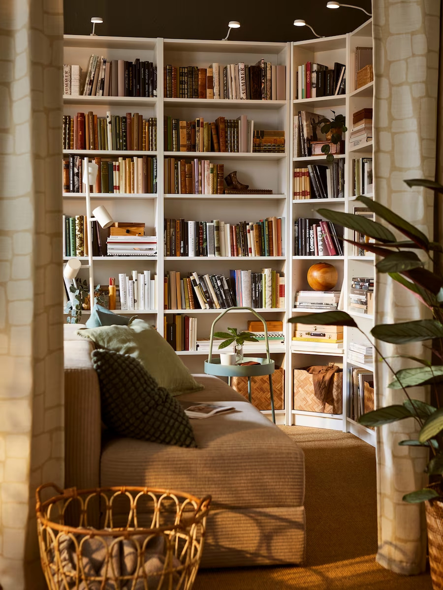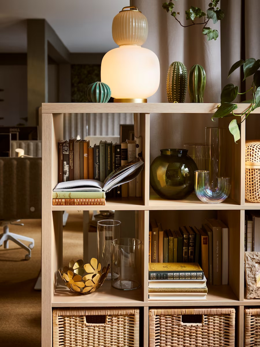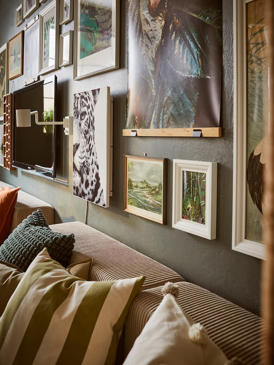 Designate areas, like this wall, where creative expression is the norm. The more, the better. If you have many pieces, use placement to create visual harmony. Done right, a TV screen and a WiFi speaker (if it’s already decorated, even better) become one with the soothing motifs.