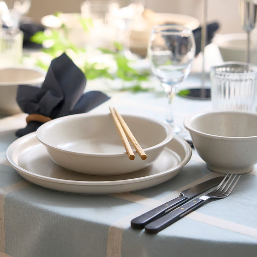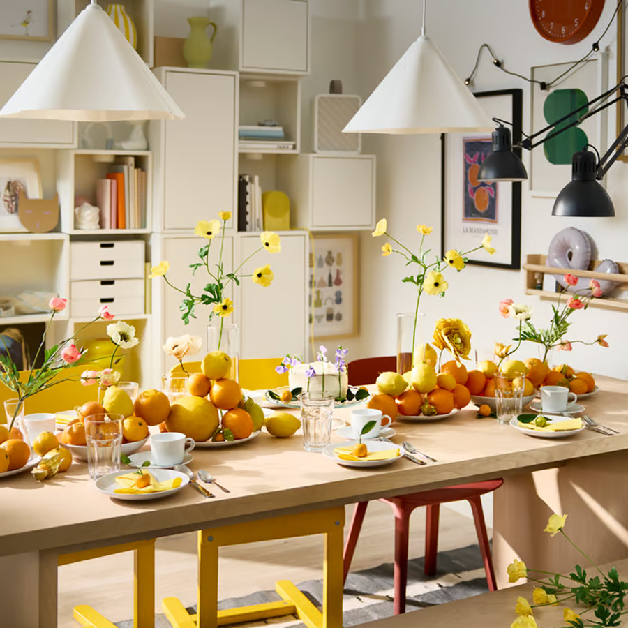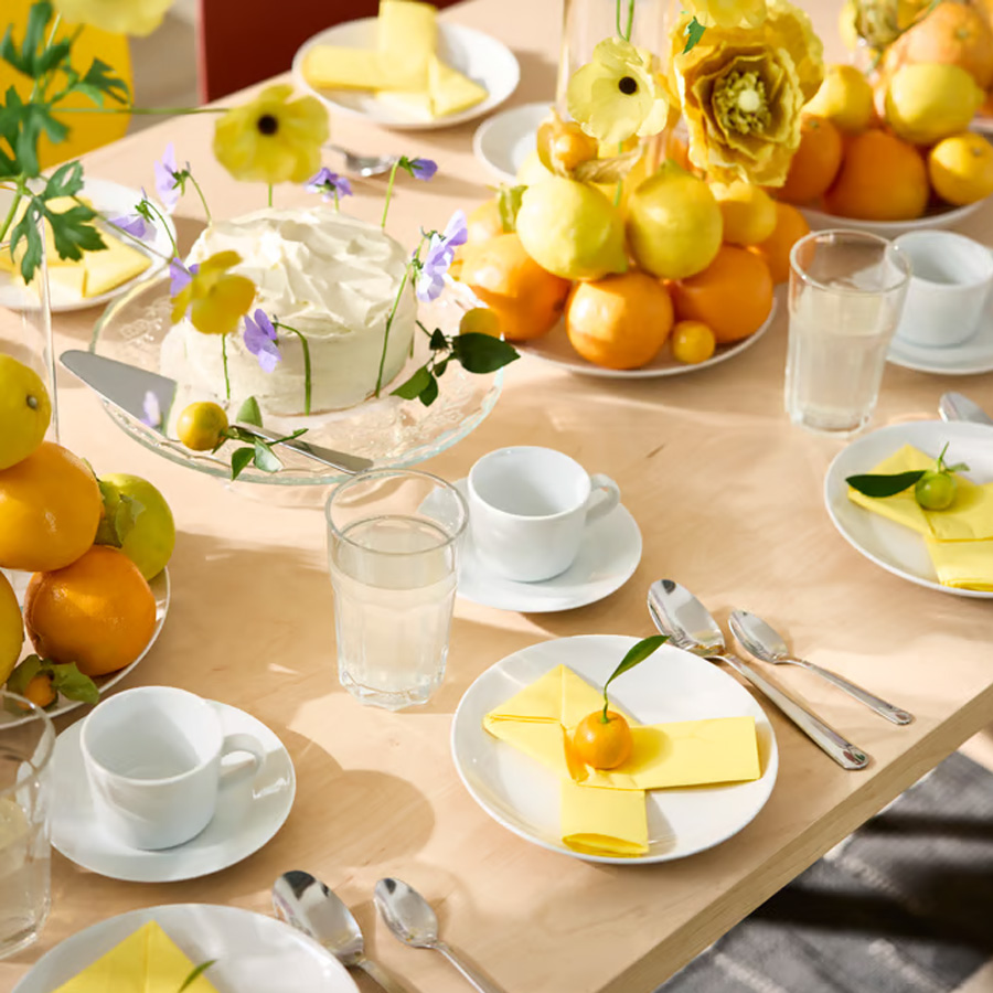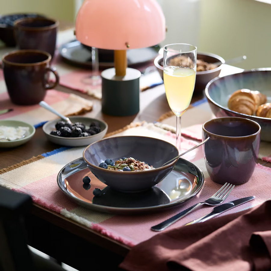 To give your breakfast table a leisurely hotel lounge feel, go for graphic simplicity with some playful elements. This table setting features a mix of colourful plates, glasses, and bowls without any frills – the dinnerware IS the décor.