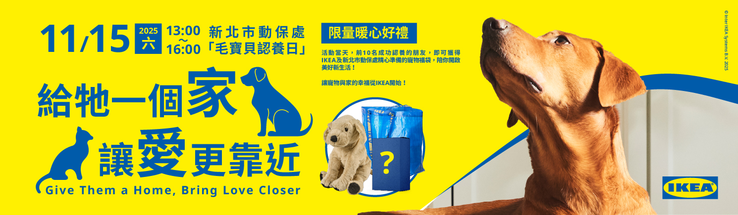 IKEA Hsin Chuang is partnering with the New Taipei City Government Animal Protection and Health Inspection Office to host Pet Adoption Day, inviting you to help find loving homes for stray animals. "Adopt with love, commit for life."