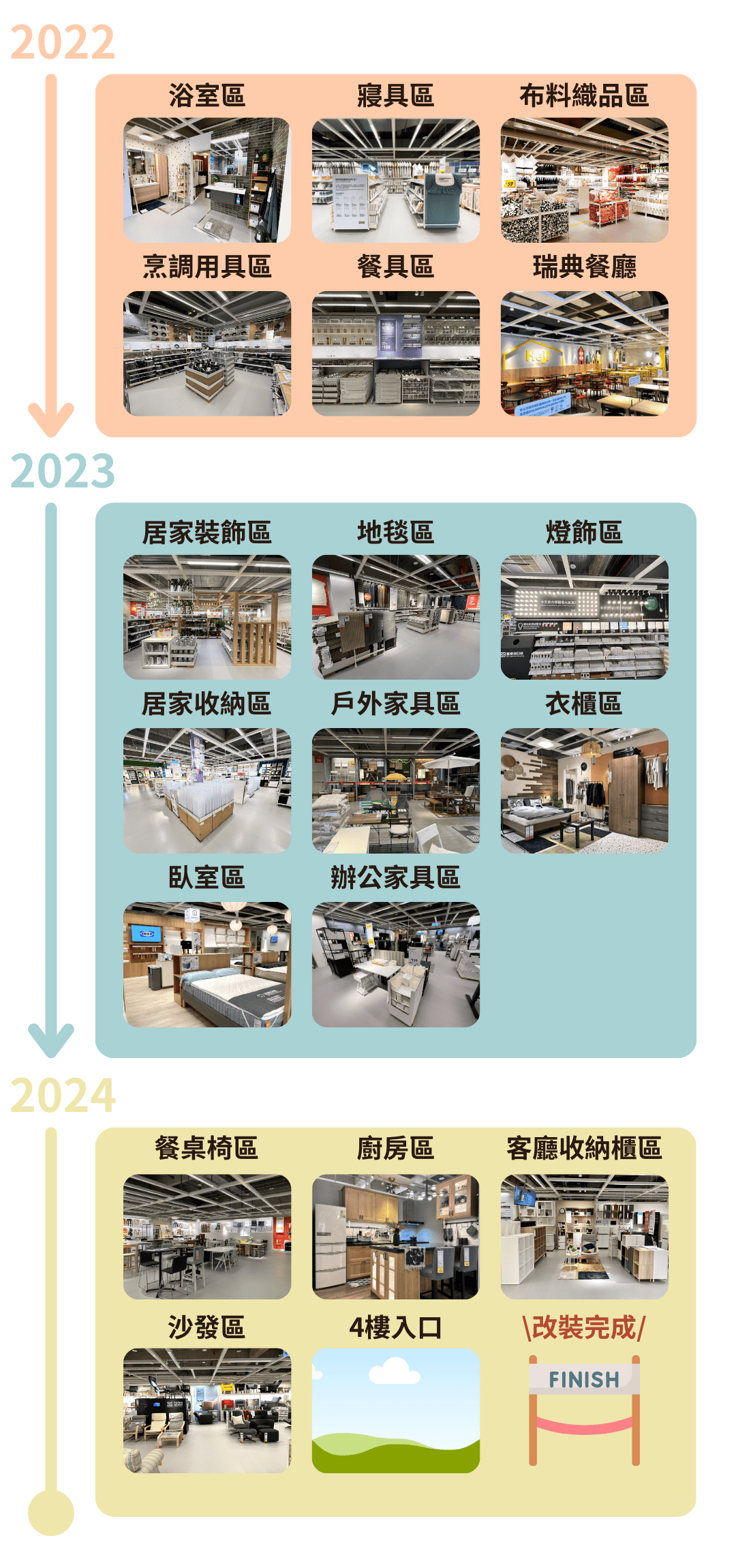 The IKEA Hsin Chuang store has undergone a renovation project for over 3years since 2021 and has finally completed it this July! We hope this renovation brings our customers a better shopping environment and experience, incluing more home decor inspiration, improved product categorization, and a brighter, more spacious store. We would like to extend our heartfelt thanks to every customer for your understanding and support over the past three years, and hope you enjoy the new store!