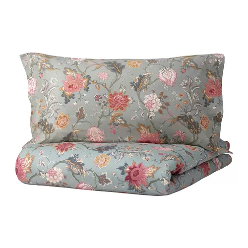 NÄSSELKLOCKA Duvet cover and 2 pillowcases, light grey-green/multicolour