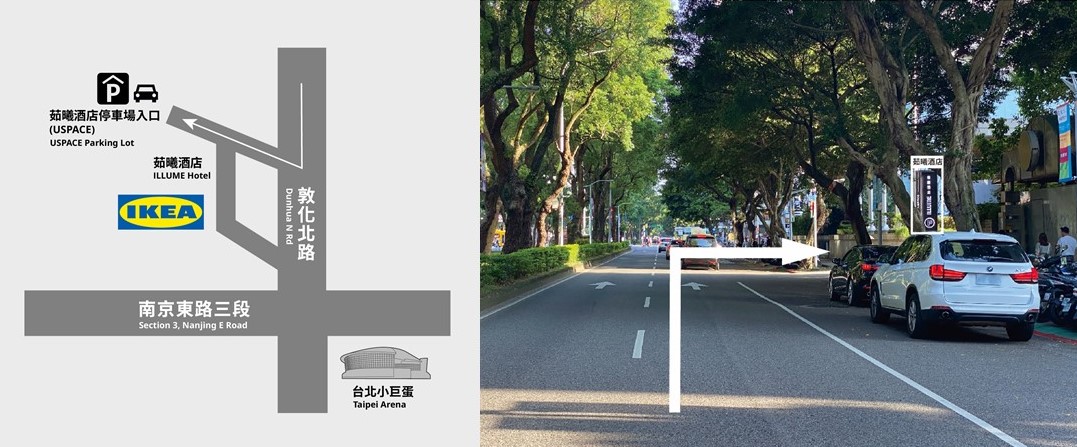 Search ILLUME hotel, and keep driving along with Dunhua N Rd. When you see the billboard for parking lot of ILLUME hotel, turn right and the entrance of parking lot is over there.