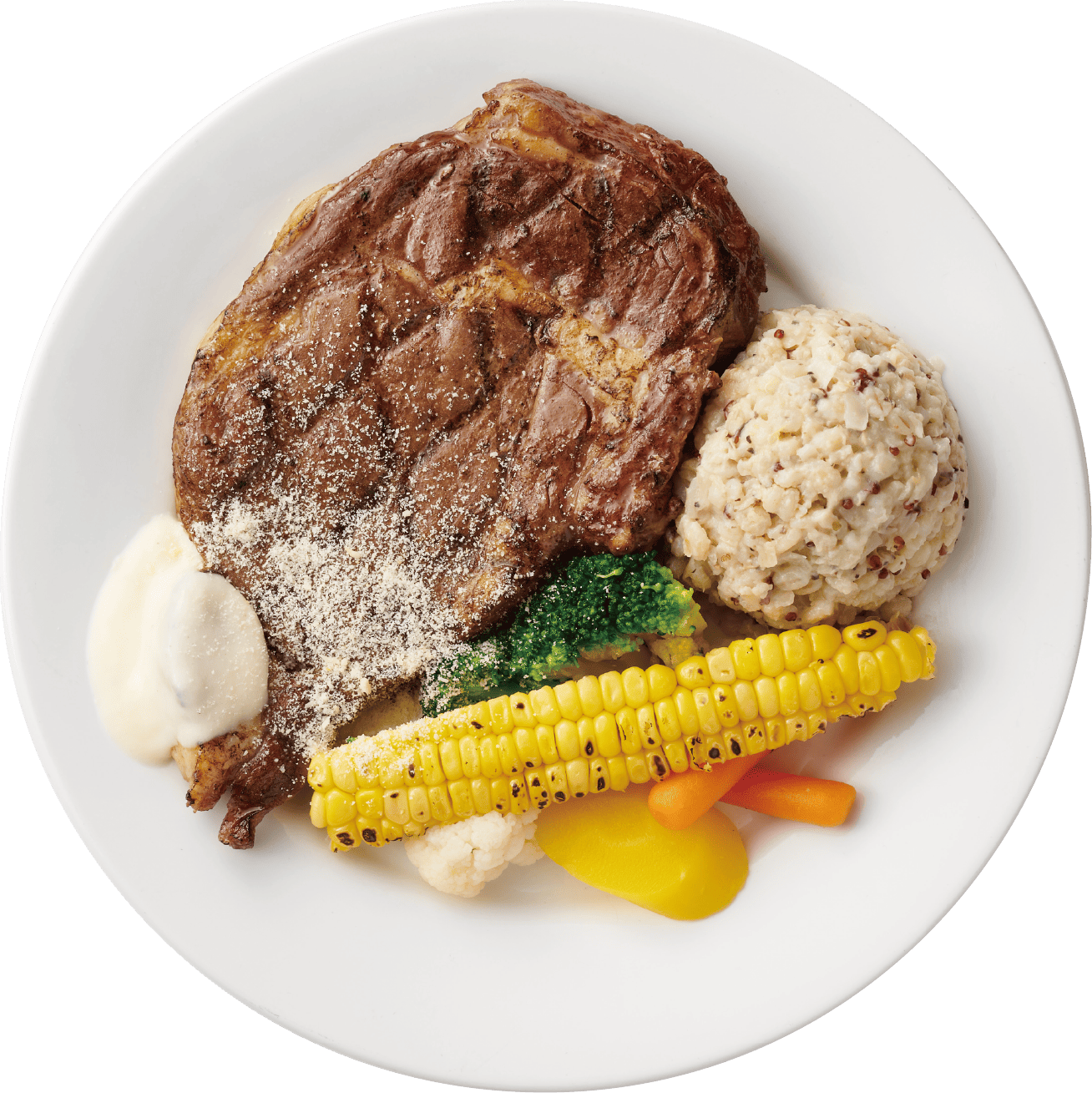 8oz. Ribeye steak、Creamy riced cauliflower、Mixed vegetables、Corn、Parmesan cheese sauce、Parmesan grated cheese