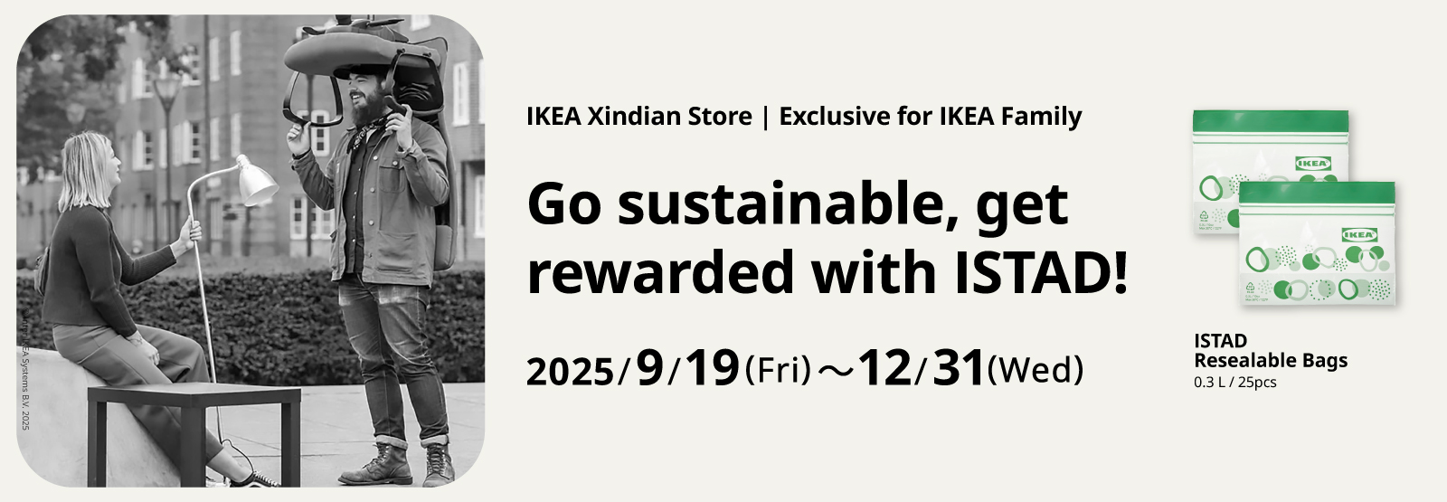 Join the circular economy! Use ESG Market or ESG.STYLE resale service before 12/31 and show your IKEA Family receipt at IKEA Xindian Store to redeem ISTAD resealable bags.
