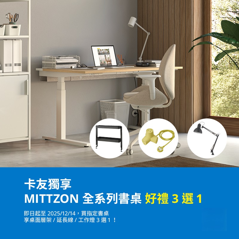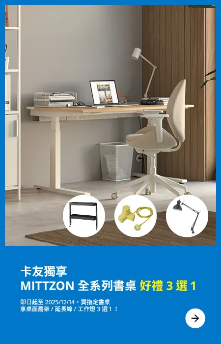 1.2025/10/23~2025/12/14活動期間,宜家卡卡友及企業卡卡友凡購買MITTZON系列桌類商品(書桌/工作桌/電腦桌/會議桌),即可兌換工作好禮三選一, 兌換日期為2025/10/23~2025/12/21止。 線上購物訂單:貨品訂購人請透過聯絡我們辦理商品退款,惟運送費用恕不退還。 2.結帳時須出示有效會員身分以享有兌換資格,每人每卡限兌換一件贈品,恕不累計。 3.凡持有實體發票/購物明細(店內購買)或電子發票(線上購買)之卡友,皆可憑發票至任一實體門市兌換贈品。 4.線上購物發票開立日期為出貨日當天,卡友可憑訂單確認信或電子發票信件於兌換期間內至任一實體門市兌換贈品。 5.本活動贈品為三選一,惟各款贈品之實際數量與顏色可能因門市而異,贈品依現場庫存為準,數量有限,送完為止。 6.贈品不得更換、兌換現金,亦不得與其他優惠合併使用。 7.如辦理退貨,須一併退回贈品;若未退回、退回不完整或已使用,將以另收取贈品原價金額。 8. IKEA保留隨時變更、取消或終止本活動之權利,無需另行通知。如有任何爭議,IKEA保留最終解釋權。